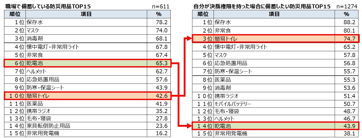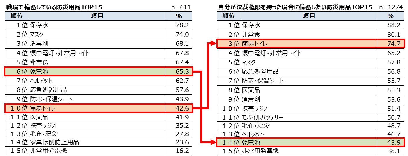 ・逆に、「乾電池」が備蓄している防災用品の6位である一方で、備蓄したい防災用品では14位と低く、