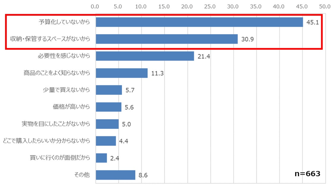 ・防災備蓄をしていない理由でもっと多いのは、「予算化していないから」で約45%
