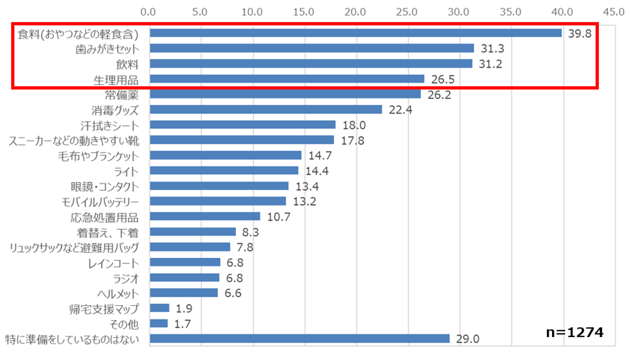 ・続いて、「歯みがきセット」と「飲料」が3割、「生理用品」も2割を超える