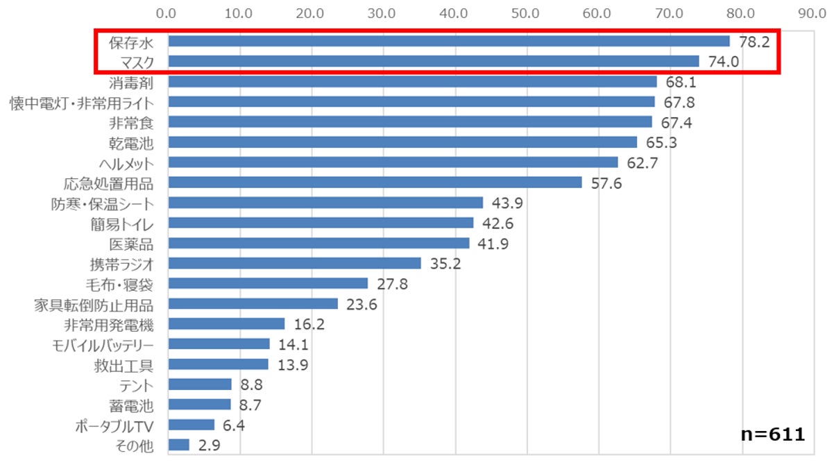 ・備蓄している防災用品で最も多いのは、「保存水」で78.2%