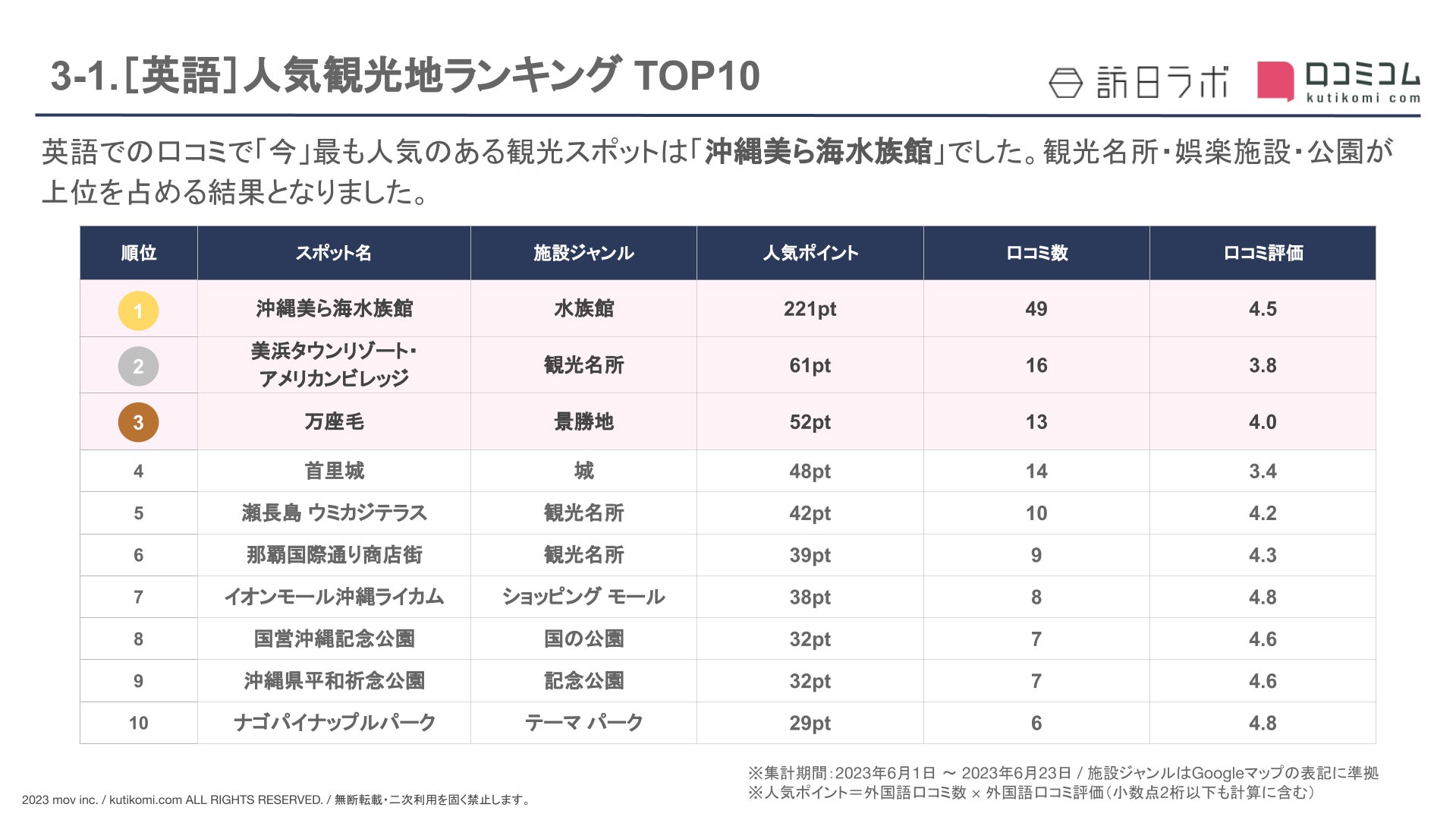 英語での口コミで「今」最も人気のある観光スポットは「沖縄美ら海水族館」でした。観光名所・娯楽施設・公園が上位を占める結果となりました。