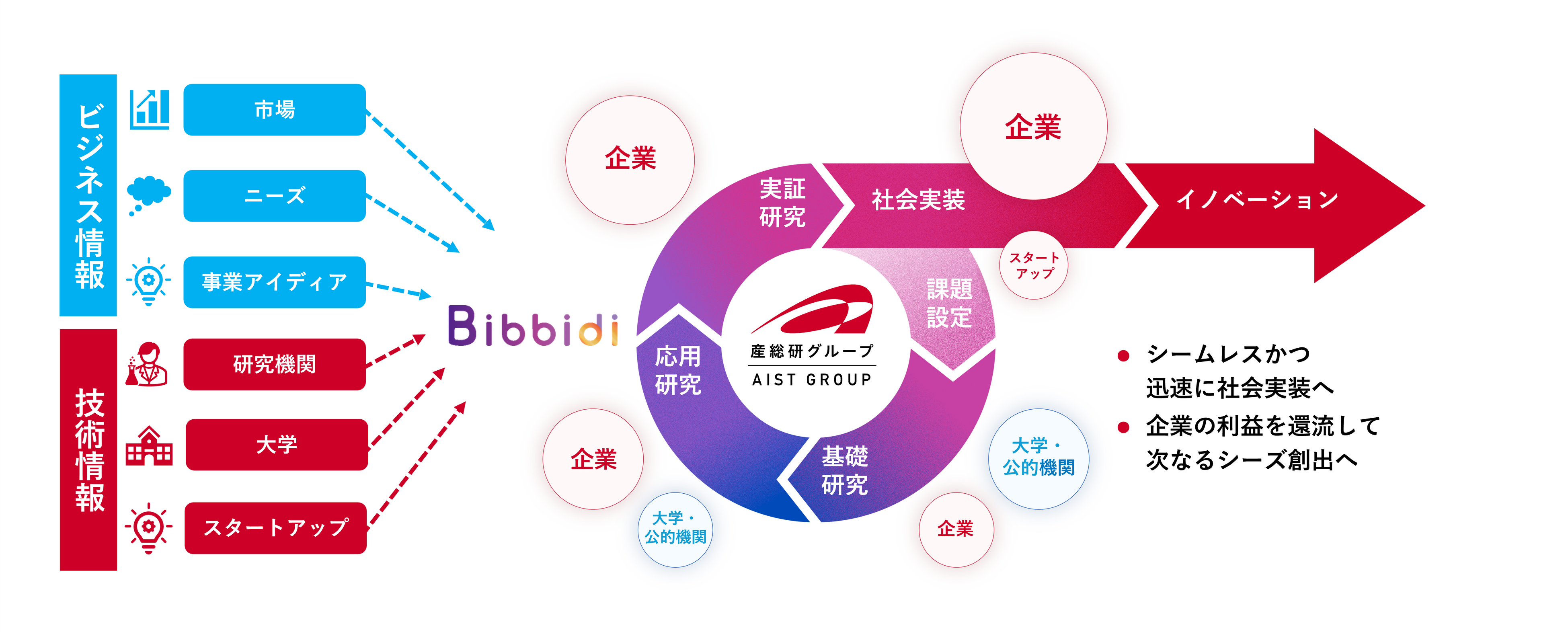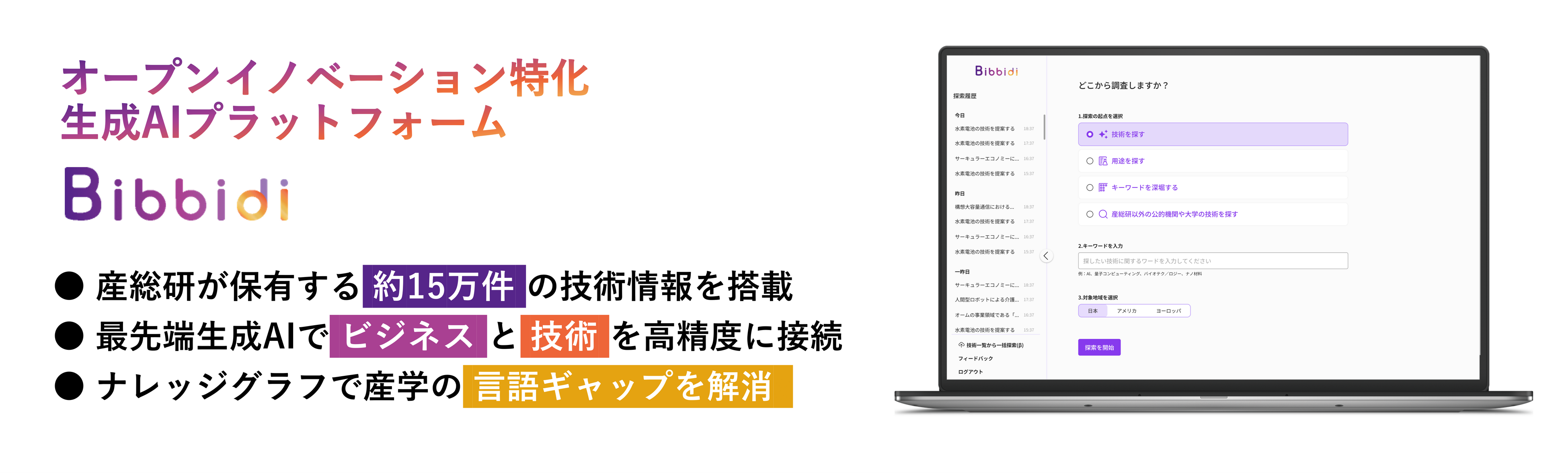 「Bibbidi」は、産総研が保有する約15万件の膨大な技術情報(シーズ)を核に、企業の事業課題/市場課題などの情報(ニーズ)と結びつけることで、産学連携によるオープンイノベーション創出を加速する生成AIプラットフォームです。