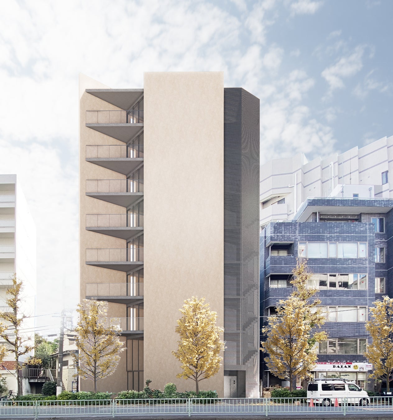 東急東横線「都立大学駅」から徒歩3分という、都心へのアクセスに優れた立地に施工中の物件です。三角形の敷地形状や周辺環境のコンテクストを読み解くことで、環境と共生する設計といたしました。交通量の多い目黒通り側には大きな壁を設け、静けさとプライバシーを確保するとともに、南北方向には開口部を設けることで、全住戸に周辺の緑道が感じられ、光や風をしっかりと取り込める快適な空間を実現しています。