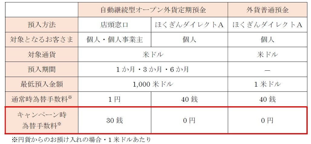 期間中、店頭窓口にて対象となる米ドルの外貨定期預金をお預け入れの際に、為替手数料を割引いたします。また、インターネットバンキング「ほくぎんダイレクトA」にて対象となる米ドルの外貨定期預金・外貨普通預金をお預け入れの際は、為替手数料が“0円”となります。