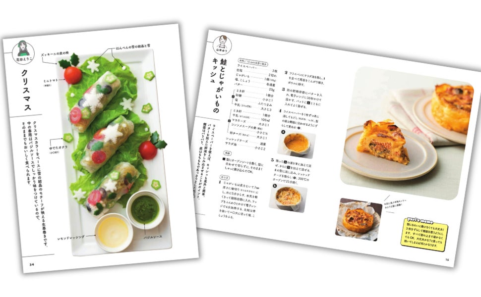 クリスマスカラーをベースに雪の結晶のモチーフが映える生春巻きや、持ち寄りパーティーにもぴったりな鮭とじゃがいものキッシュなども!華やかなシーンにも「ライスペーパーレシピ」が大活躍。