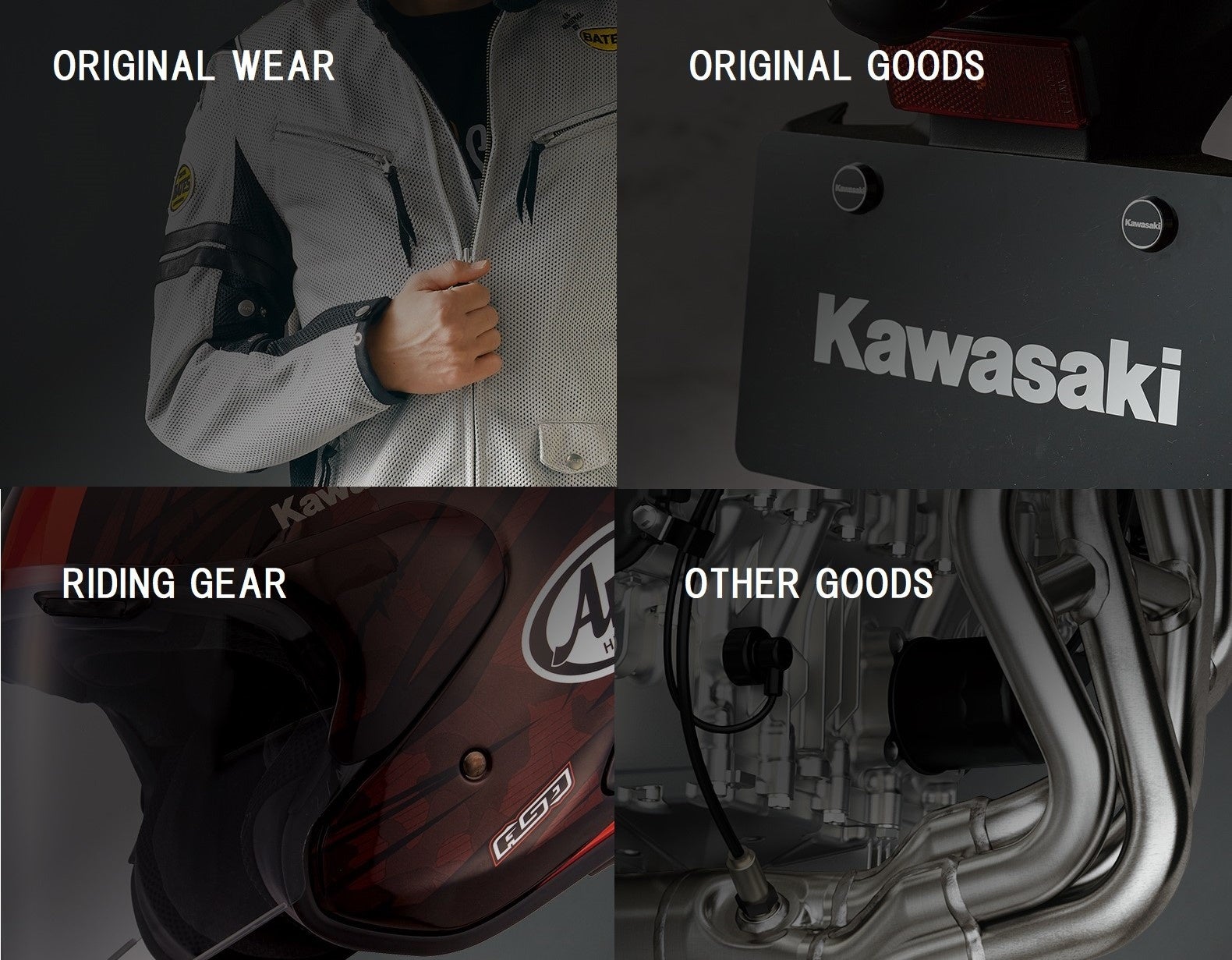 カワサキオンラインショップでは、カワサキ(日本国内)で取扱いのあるモーターサイクルやジェットスキーの補修部品をはじめ、モーターサイクルライフに必要なライディングギアや、あるだけで楽しめるグッズ等、カワサキ独自視点で製作されたオリジナルアイテムを販売しています。