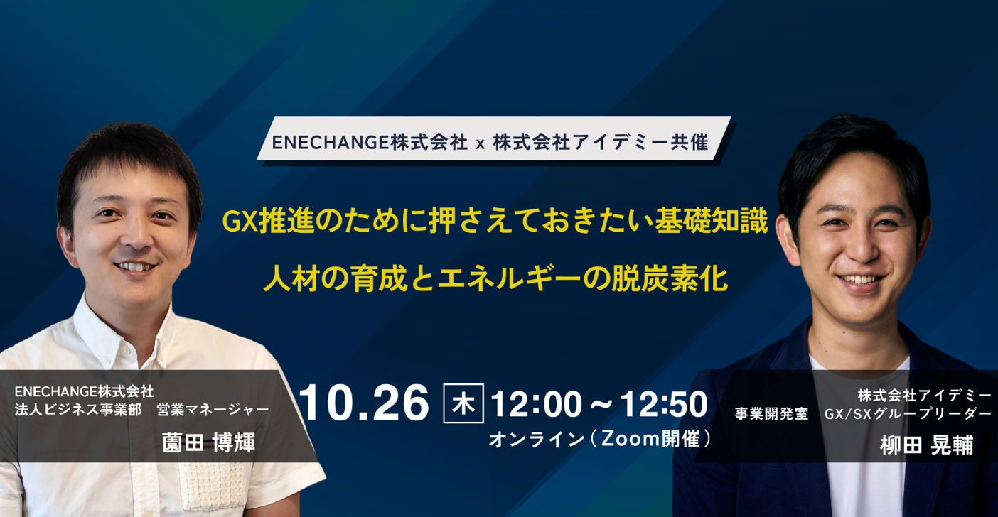 今回の業務提携にあたりまして、2023年10月26日(木)12時より、共催セミナー「【ENECHANGE×アイデミー】GX推進のために押さえておきたい基礎知識:人材の育成とエネルギーの脱炭素化」を開催します。