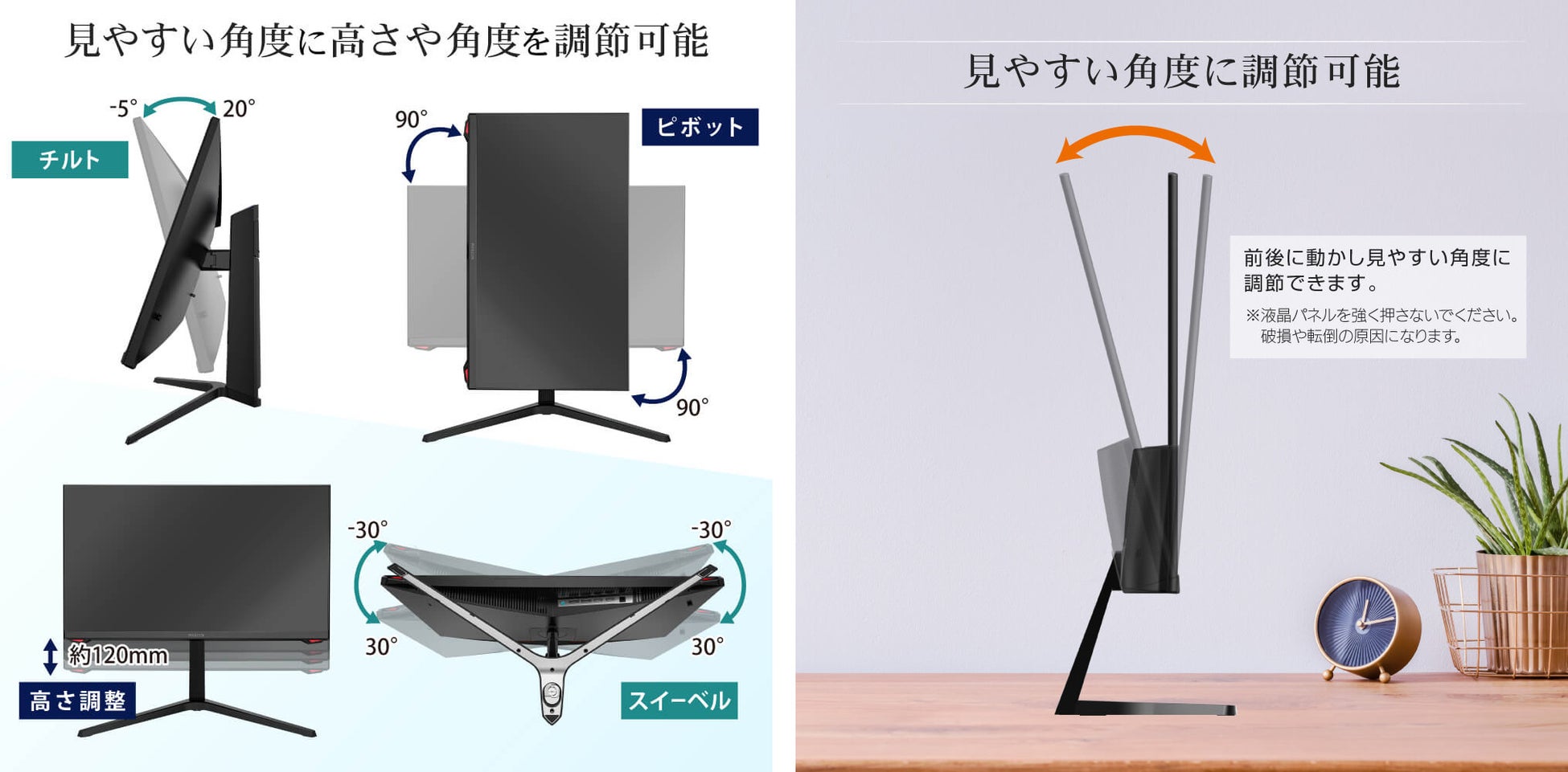※液晶パネルを強く押さないでください。破損や転倒の原因になります。