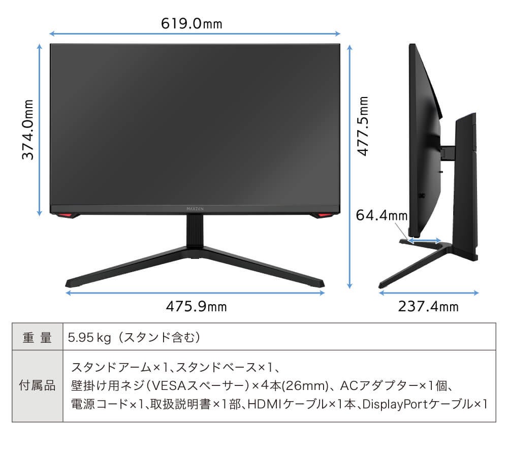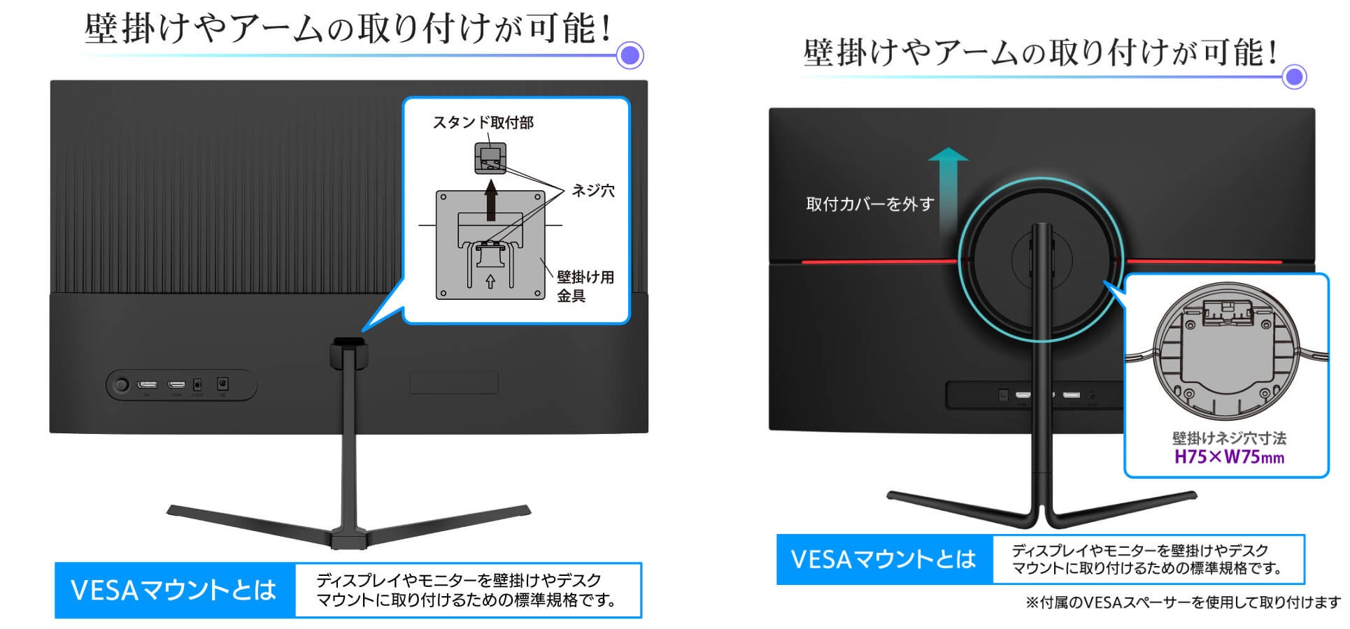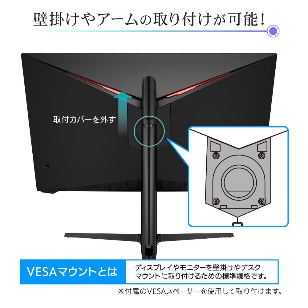 ※VESAマウントとは:ディスプレイやモニターを壁掛けやデスクマウントに取り付けるための標準規格です。