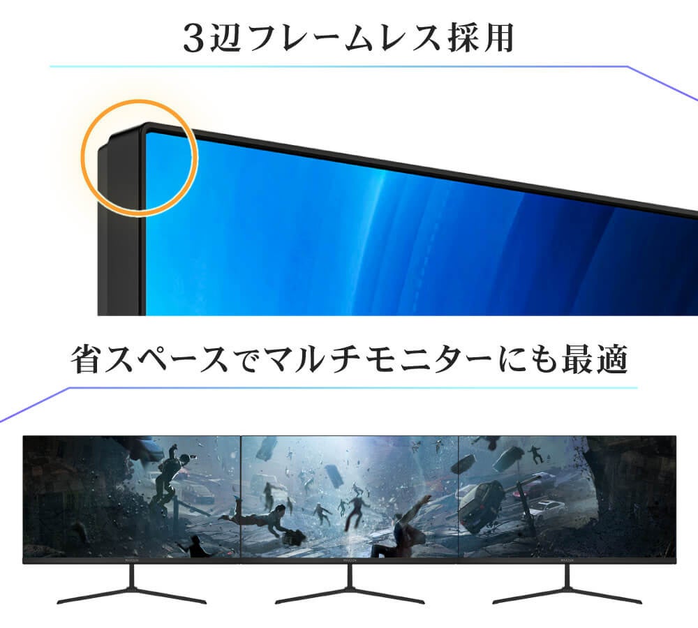 モニターの枠の幅を可能な限り狭くした3辺フレームレスを採用したことで、サイズをフル活用した大画面でゲームを楽しむことができます。また、モニターを並べて置いても画面と画面のつなぎ目が邪魔にならないので、マルチモニターを省スペースで実現できます。