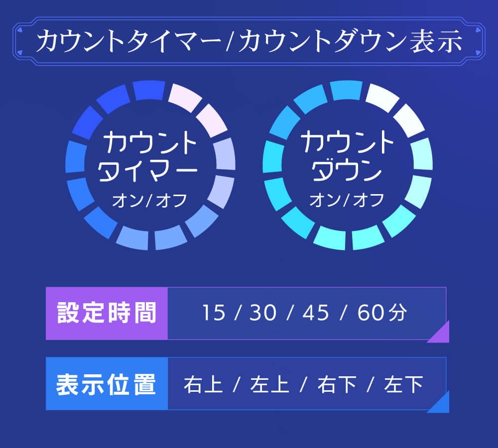 オンとオフの時間を表示するカウントタイマーやカウントダウン表示は、15分刻みで設定することができ、ゲーム中の時間を管理しやすくすることが可能です。また、表示位置を四隅のいずれかに変更することができる為、ゲームによってはタイマーと文字等が被って見づらいといったことが無くなります。