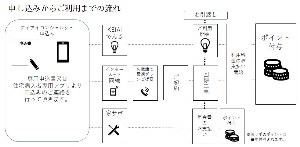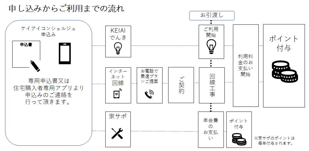 当社物件の購入者を対象に専用の申込書にご記入、または住宅購入者限定アプリから申込希望のご連絡をして頂きます。KEIAIインターネットにご加入いただき、ご利用開始後に10,000ポイントを付与いたします。さらに「ケイアイコンシェルジュ」の他のサービスにご加入いただいた場合、2つのサービスご加入で、合計25,000ポイントを、3つのサービスご加入で合計30,000ポイントを付与します。