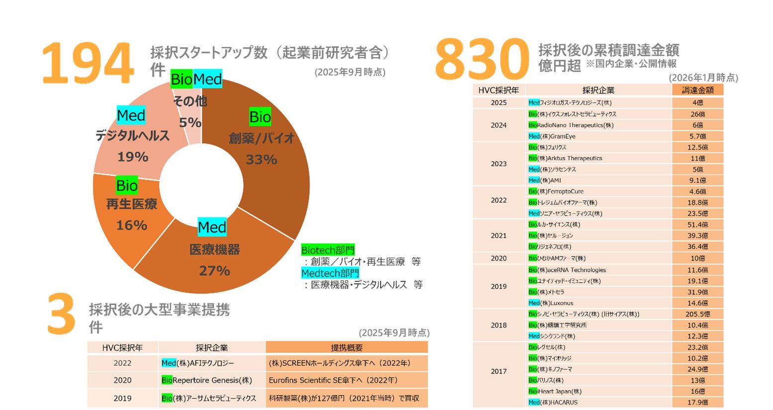 ヘルスケア産業の裾野を広げ、スタートアップの国境を越えたビジネス展開支援を目的とし、2016年より実施する本プログラムも10期目を超えました。これまでの採択スタートアップは194件(創業前の案件含む)にのぼり、採択後資金調達額は累積830億円(2026年1月時点・公開情報・国内企業限り)を超え、海外拠点開設・大型事業提携・J-startup認定・AMED事業採択など、過去登壇者は目覚ましい活躍をされています。
