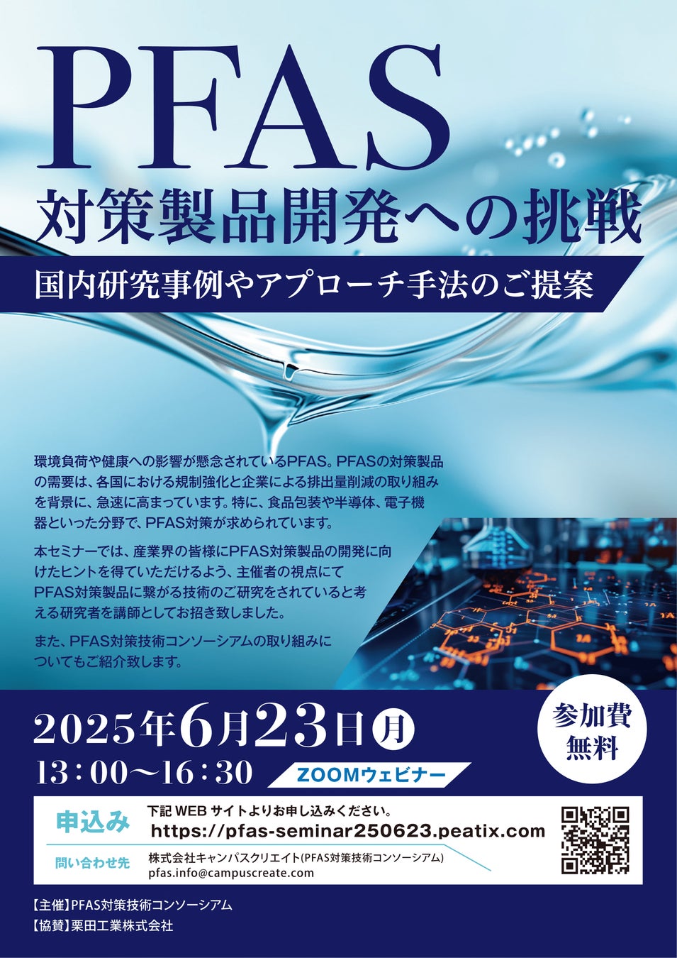 株式会社キャンパスクリエイトが事務局を務めるPFAS対策技術コンソーシアムは、PFAS対策製品開発への挑戦をテーマとしたオンラインセミナーを6月23日に開催致します。参加費無料。
