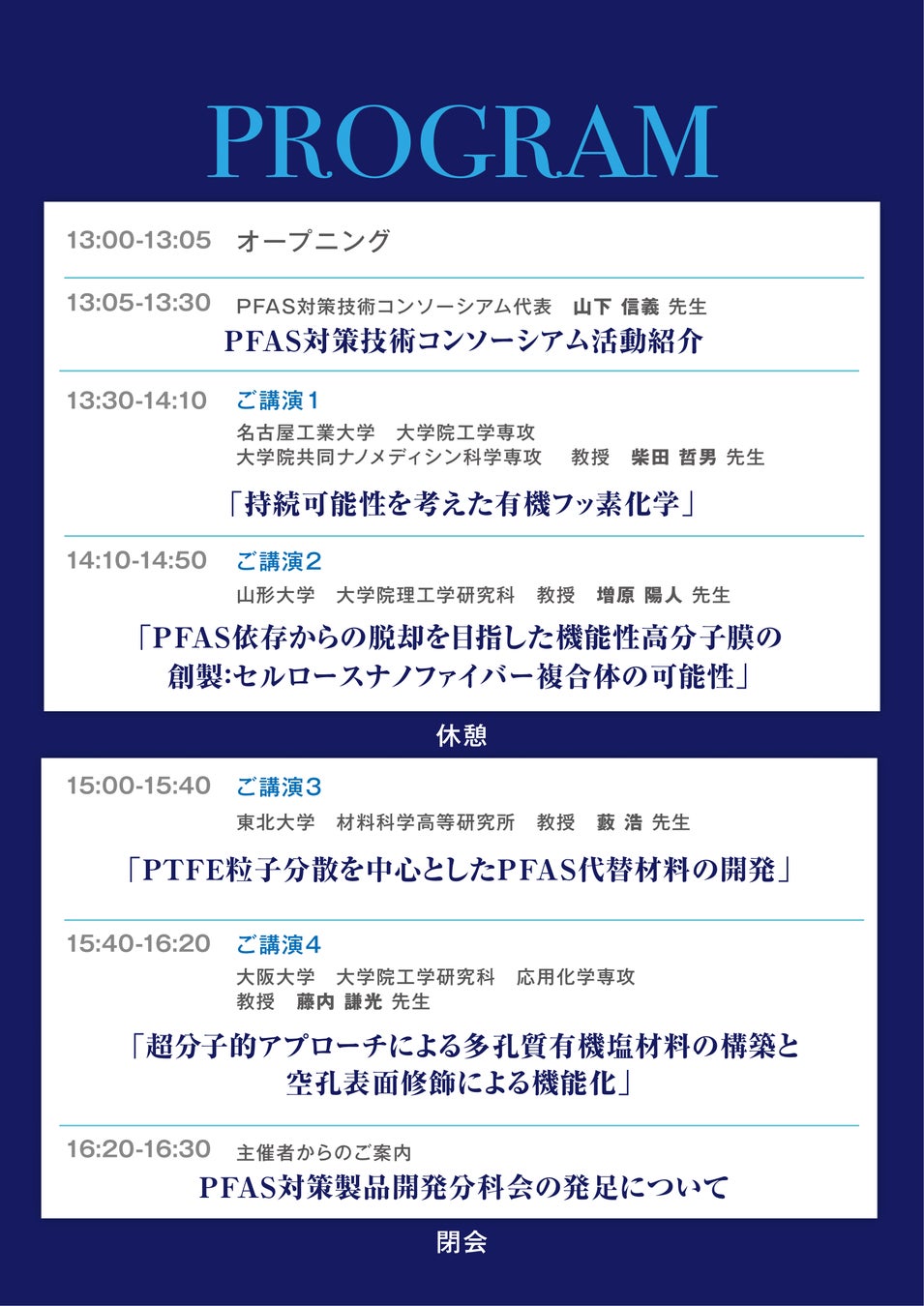 本セミナーでは、産業界の皆様にPFAS対策製品の開発に向けたヒントを得て頂けるよう、主催者の視点にてPFAS対策製品に繋がる技術のご研究されていると考える研究者を講師としてお招き致しました。