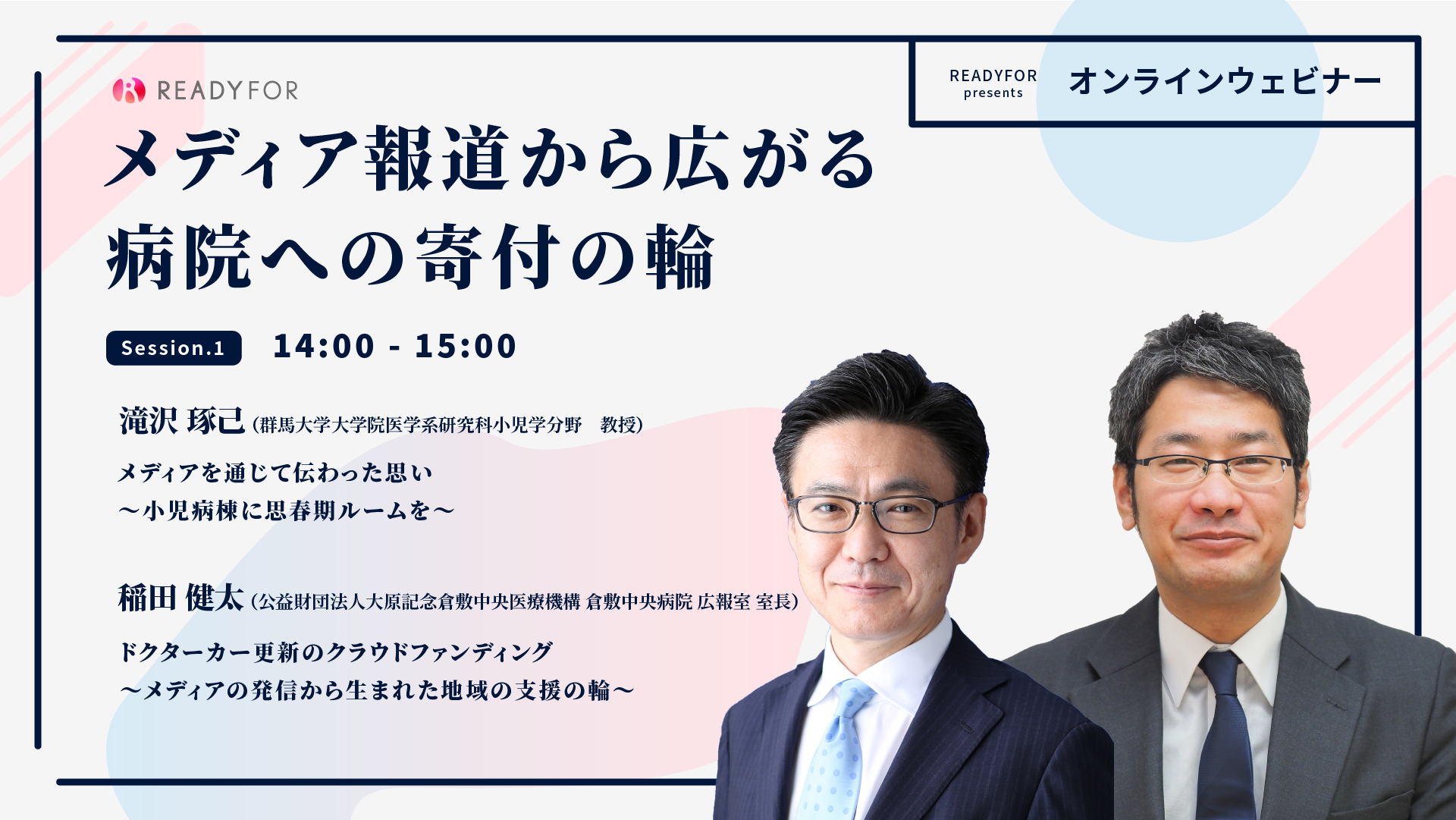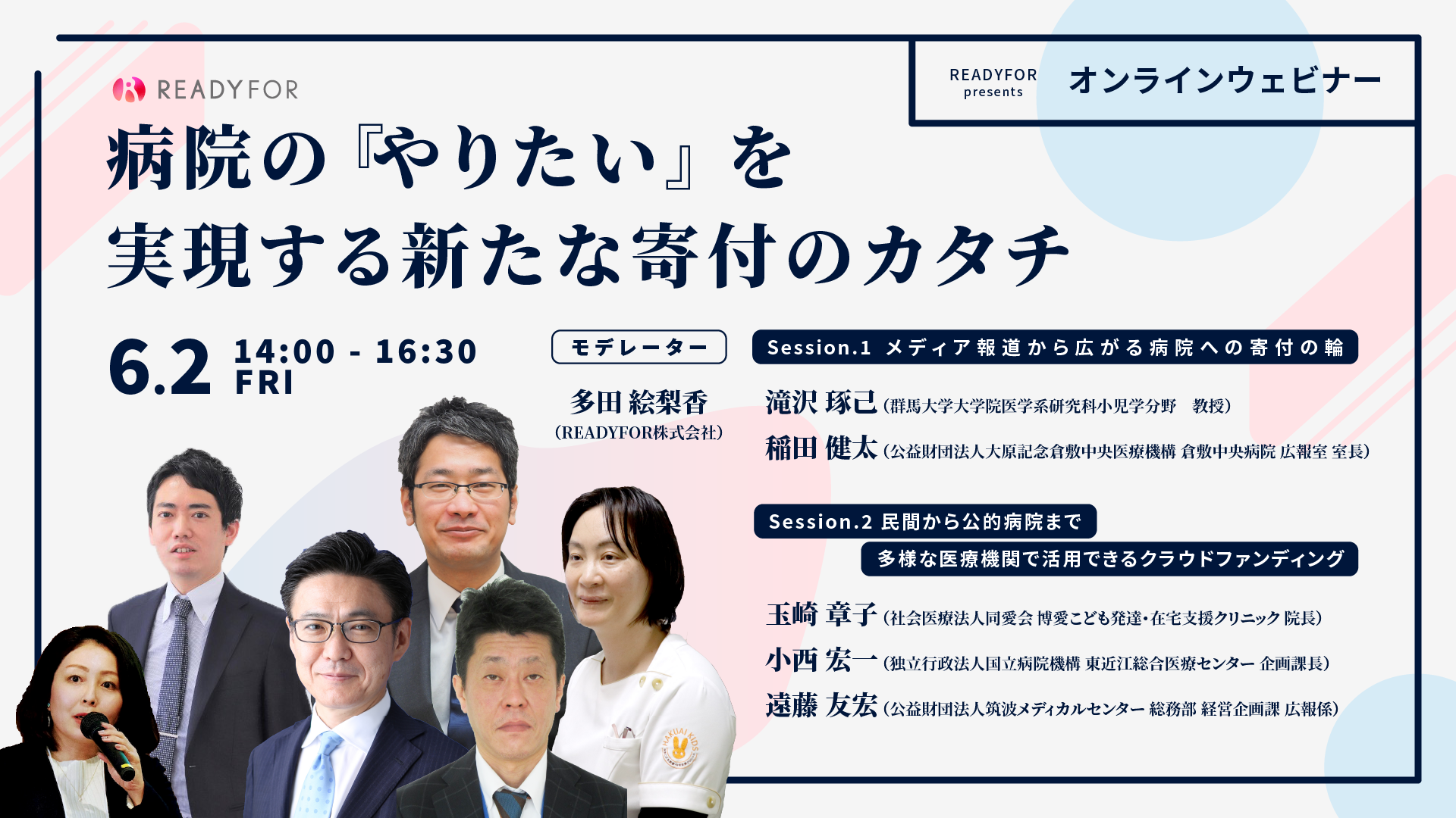日本初・国内最大級のクラウドファンディングサービス「READYFOR」を運営するREADYFOR株式会社は、2023年6月2日(金)にオンラインウェビナー「病院の『やりたい』を実現する 新たな寄付のカタチ」を開催いたします。