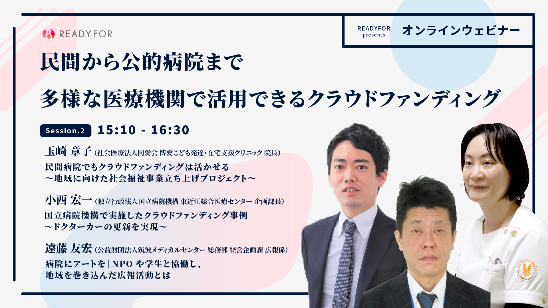 Session2 / 15:10-16:30 民間から公的病院まで|多様な医療機関で活用できるクラウドファンディング