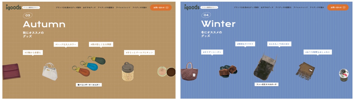 そこで、アパレル業界特有のグッズ制作における「シーズン限定アイテムのアイディアがマンネリ化している」「既存の販売品と被らず高級感あるグッズ制作をしたい」「業界トレンドを取り入れたい」などの課題に対し、当社だからこそ提供できるノウハウがあるのではないかと考え、アパレル業界向け専門ページを公開する運びとなりました。