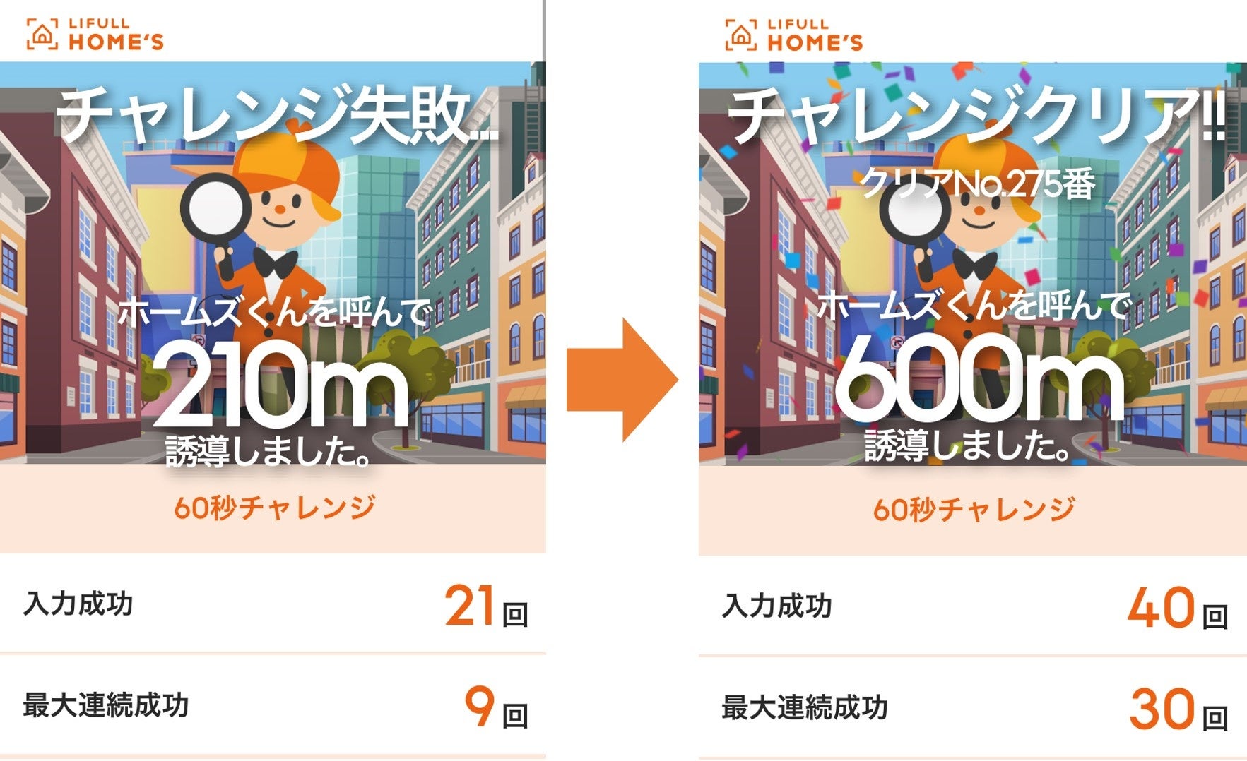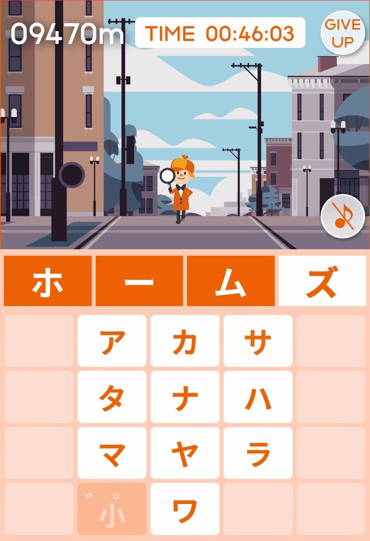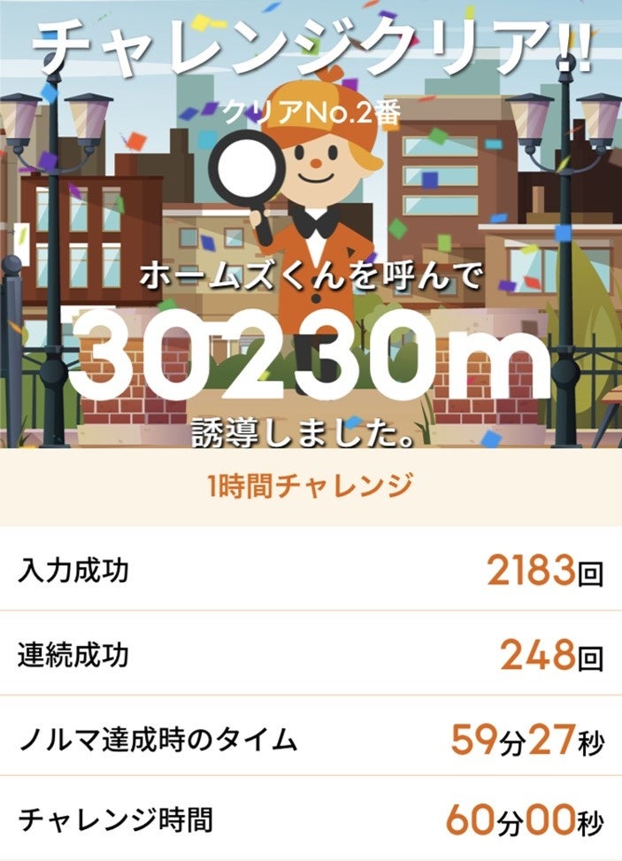 「ホームズ」1回の入力で10m進みます。10回連続入力成功で50mのボーナスが付与されます。