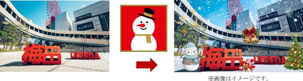 阪急サン広場に雪が降り、クリスマスツリーや雪だるまが登場します。