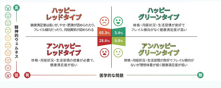 健康満足度という「感情的なウェルビーイング」の高低と、医学的な問題の有無で分析 軸として4象限を設定しました。健康満足度が高く、医学的問題がない人を「ハッピーグ リーンタイプ」健康満足度が高く、医学的問題がある人を「ハッピーレッドタイプ」健康 満足度が低く、医学的問題がない人を「アンハッピーグリーンタイプ」、健康満足度が低 く、ウェルネス介入が必要な層を「アンハッピーグリーンタイプ」とします。これらを「渋谷ウェルネスタイプ」という枠組みとします。この「ハッピーグリーンタイプ」の増加が今後重要なテーマとなります。