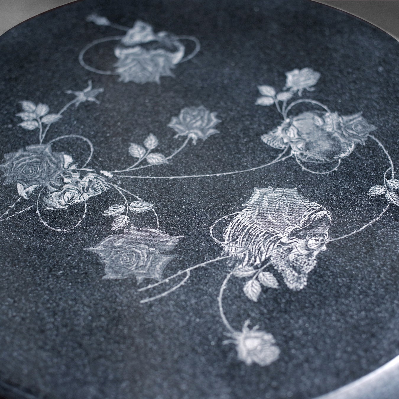 今回はベルジェスツール(羊飼いの椅子)から着想を得た3つ足のスツールを制作。天面にはYohji Yamamoto POUR HOMMEのコレクションで発表された“スカル&ローズ”柄が伝統を受け継ぐ石材職人による特殊な彫りで施されています。