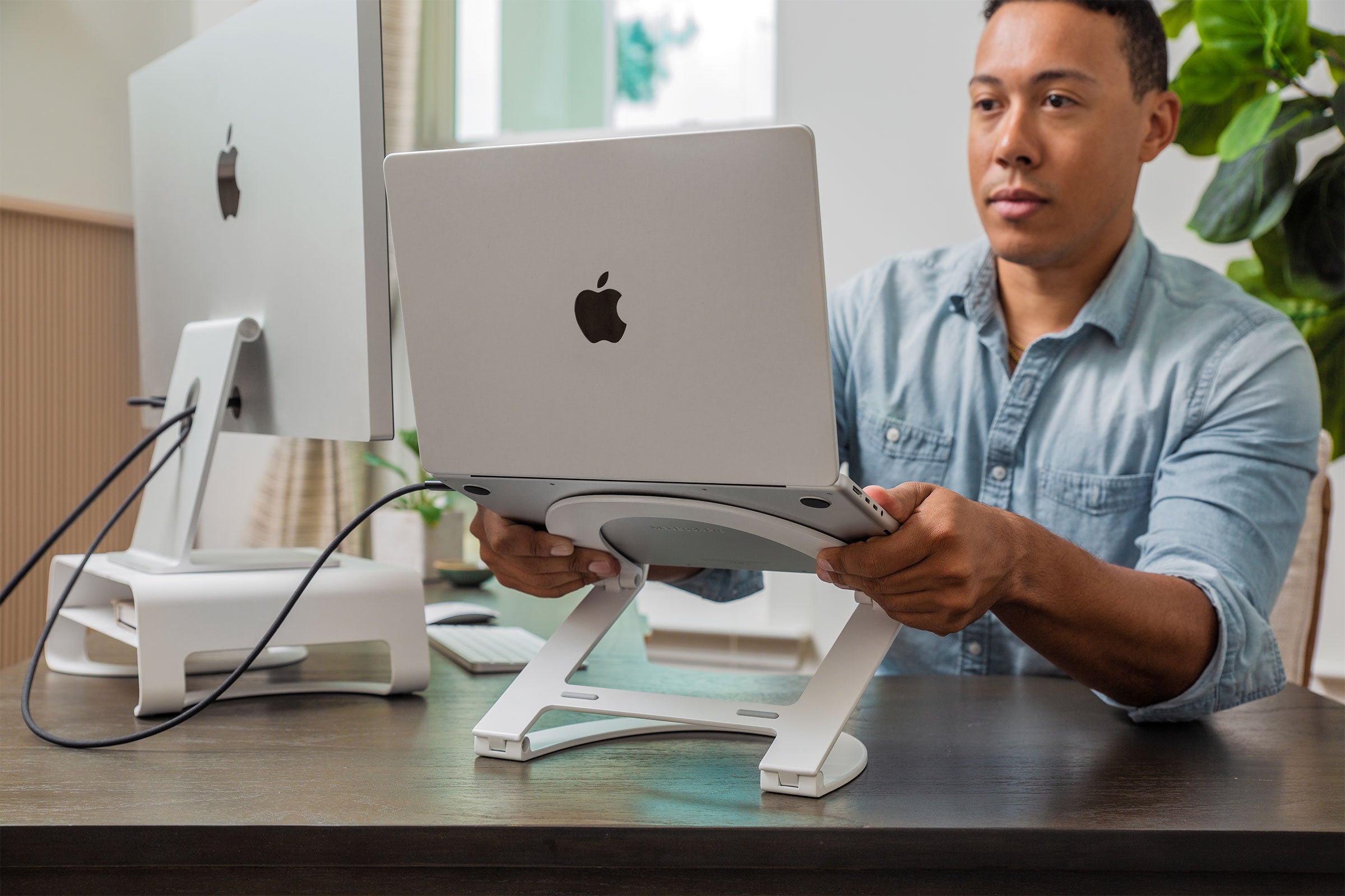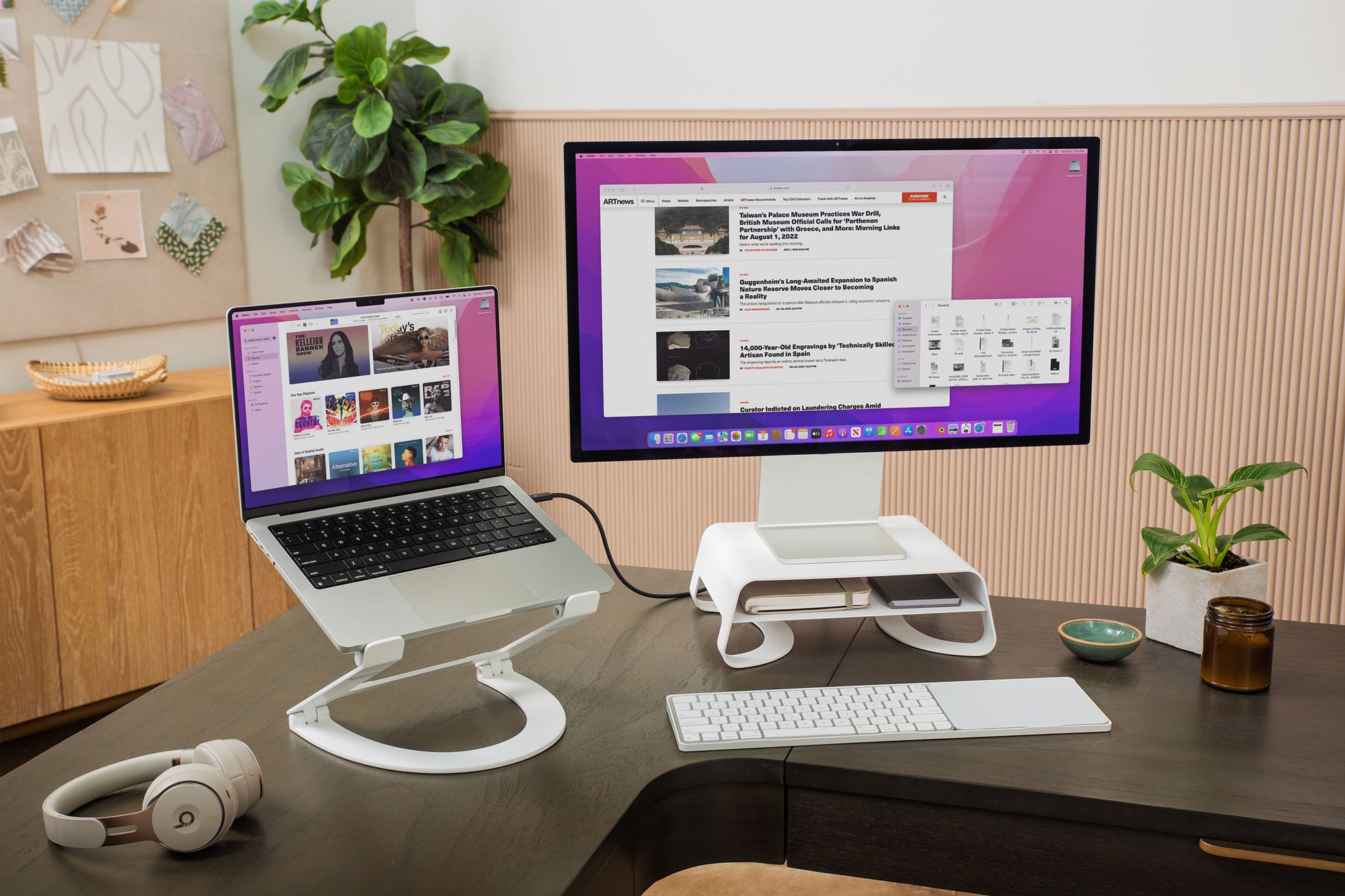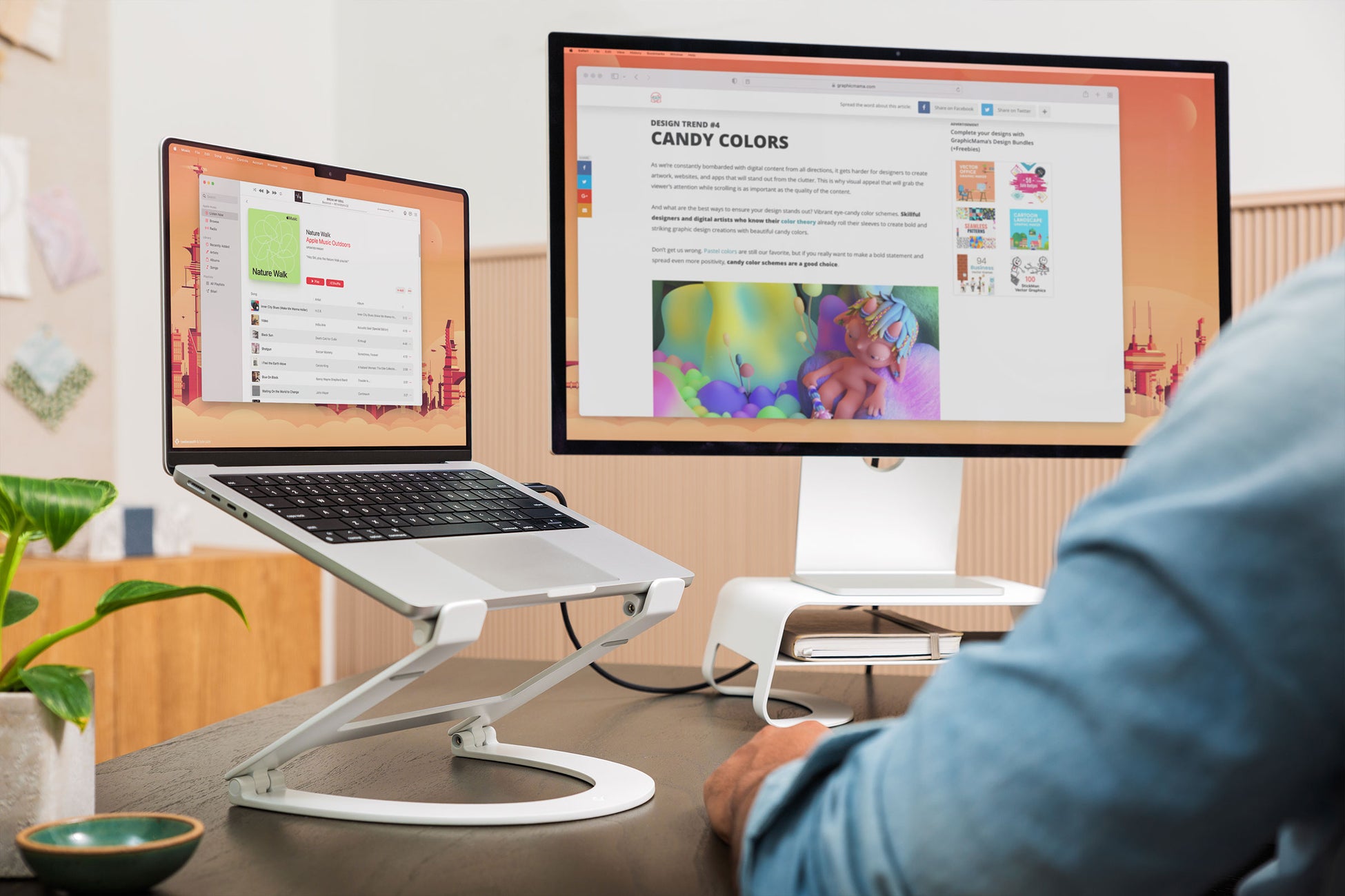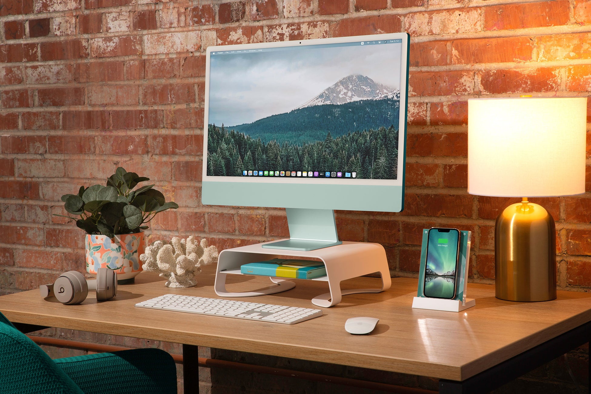Twelve SouthのCurve Riserを使用すると、iMacやディスプレイを10.8cm上げることができます。Curve Riserは人間工学に基づいた設計となっており、ディスプレイをより見やすい高さへと変えます。リビングのテーブルやオフィスのデスクなど、少し高さを変えるだけでも視線の角度が代わり、首や肩への負担が軽減する効果が期待できます。画像や映像の編集、文書や表計算の作成、そしてビデオ会議などにおいても快適。周囲に注意をそらされることなく作業に集中することができるはずです。