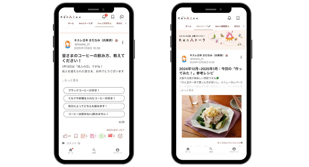 「ネスレ Ken人こみゅ」の「Ken」という文字には地域(県)、健康(健)、社会貢献(献)、豆知識・お役立ち(賢)の4つの意味が込められており、コミュニティ内では、参加者同士がネスレ商品を日常で楽しむ様子を投稿し合えるほか、ふるさとや旅先での景色・グルメの紹介、管理栄養士監修の「ネスレ バランスレシピ」(https://nestle.jp/home/recipes)をもとに作った料理投稿、日々のちょっとしたエコ活動の投稿を楽しむことができます。