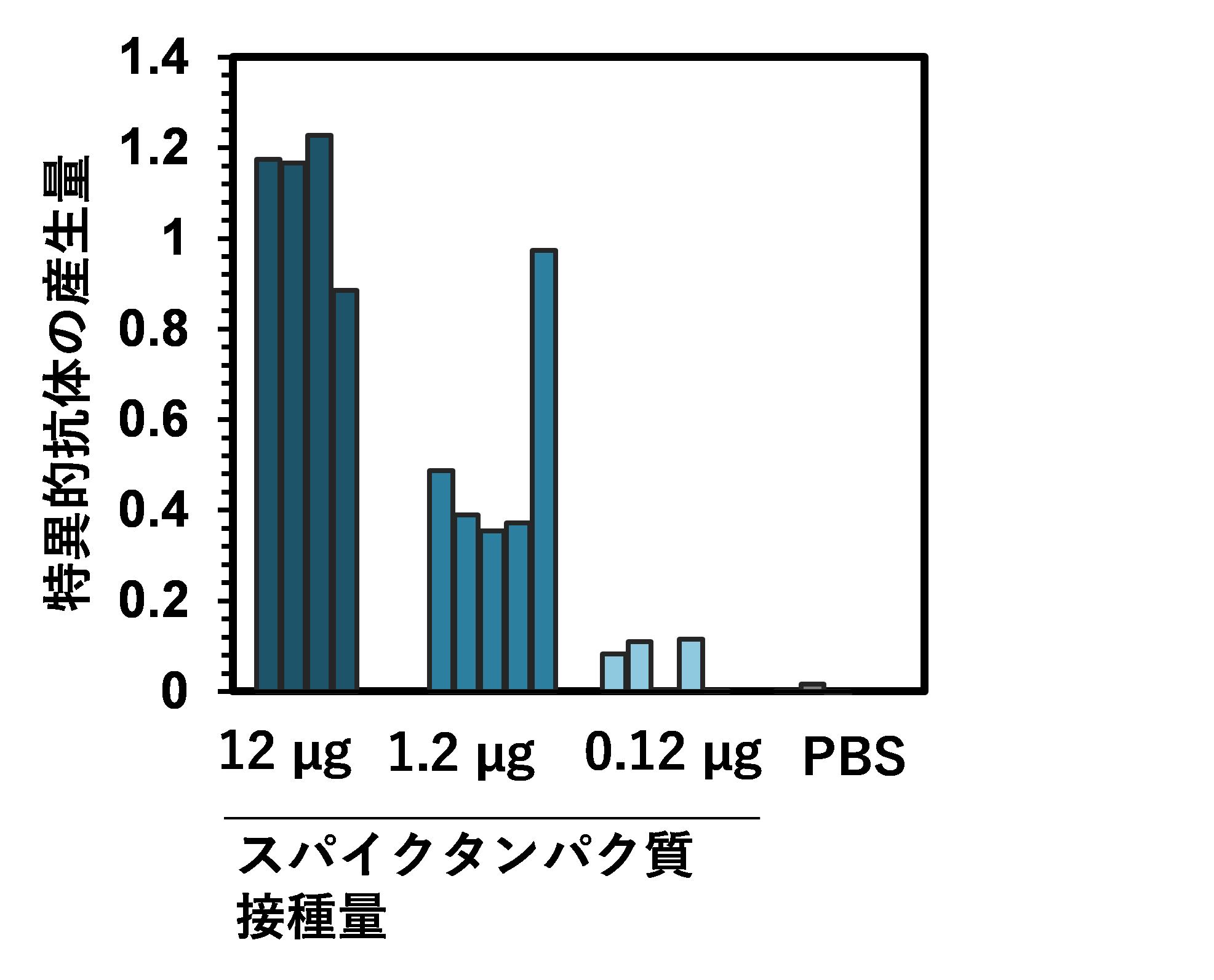 その精製した組換えスパイクタンパク質を抗原とした特異的抗体産生能を確認するために、12、1.2、0.12 µgのスパイクタンパク質を、マウスなどの研究で使用されているアジュバントであるフロイントアジュバント(CFA及びIFA)※9とともにマウスにそれぞれ接種し、スパイクタンパク質特異的抗体(IgG)の産生量を測定しました。その結果、用量依存的な特異抗体が検出されました(図1)。