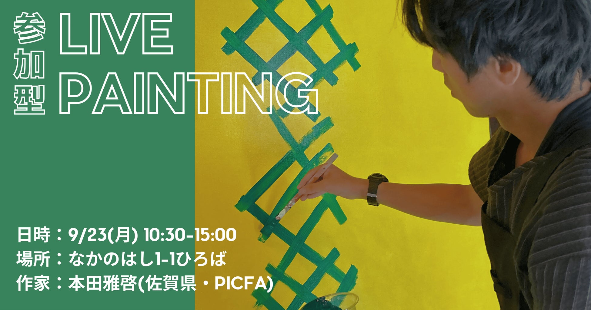 本事業は盛岡が人と音楽で溢れる日に、多様な価値観に触れていただく機会の創出を目指し開催する岩手銀行との共創事業のひとつです。当日は、アーティストの本田雅啓さんを招き、幅2mほどの大きなキャンバスに一般参加者のみなさんとアートをつくりあげます。参加者が描いた下絵の上に、本田さんが実際に盛岡のまちを歩き、見て、感じたイメージから着想を得たモチーフを描き、作品を即興で制作します。