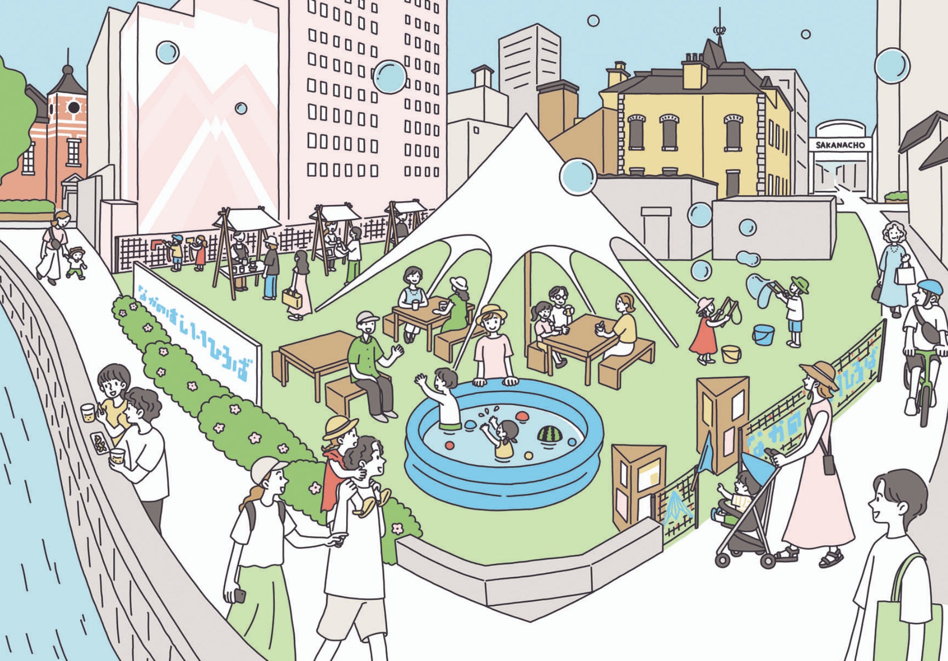 まちなか広場「なかのはし1-1(いちのいち)ひろば」「愛称:いちわん」。盛岡の中心地にある交流拠点として、人工芝やテント、イステーブルなどを設置して広場として開放し、休日にはさまざまなイベントも開催されている。