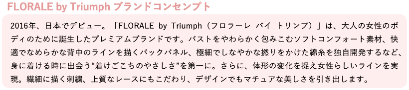 自分らしいここちよさをランジェリーを通して叶える「COMFORT MY WAY ここちいい、私でいく。」を掲げるトリンプ・インターナショナル・ジャパン株式会社(本社:東京都中央区築地5-6-4、代表取締役社長:ヴァンサン・ネリアス)より、フェミニティあふれる大人の女性のためのコレクション『FLORALE by Triumph(フロラーレ バイ トリンプ)』の新作を、3月2日(水)より順次発売します。