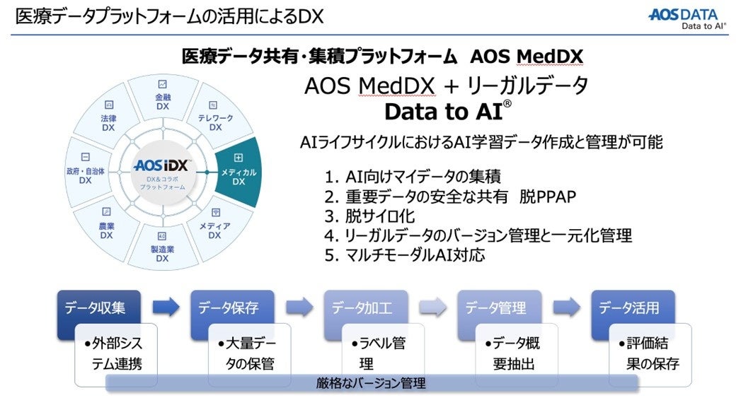 AOS MedDXでは、こうしたAIライフサイクルの仕組みとマルチモーダルAIへの適用に基づき、AIデータにおけるAIシステムのためのAIデータ管理を行い、医療における優秀なデータがあって初めて優秀なAIシステムを実現できるというData to AIのコンセプトの元、AOS MedDXによって、医療データの利活用の促進、リスクの最小化、より質の高い医療データ管理に向けたプラットフォーム構築を支援します。
