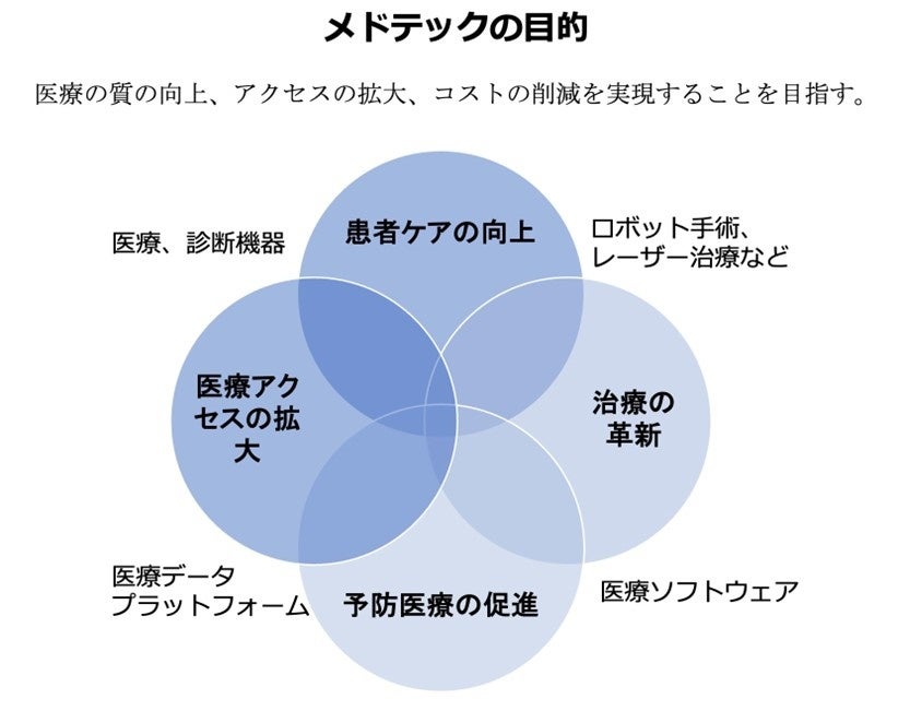 これらの目的は、全体として、医療の質の向上、アクセスの拡大、コストの削減を実現することを目指しています。メドテックは、これらの目的を達成するための技術や手法を提供する重要な役割を果たしています。