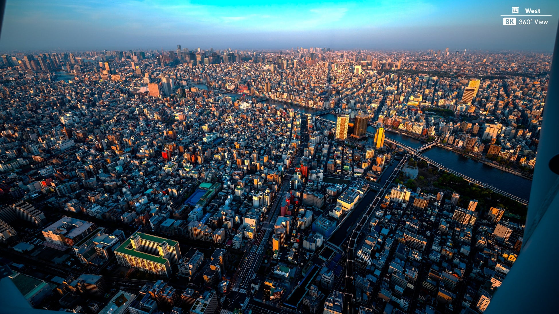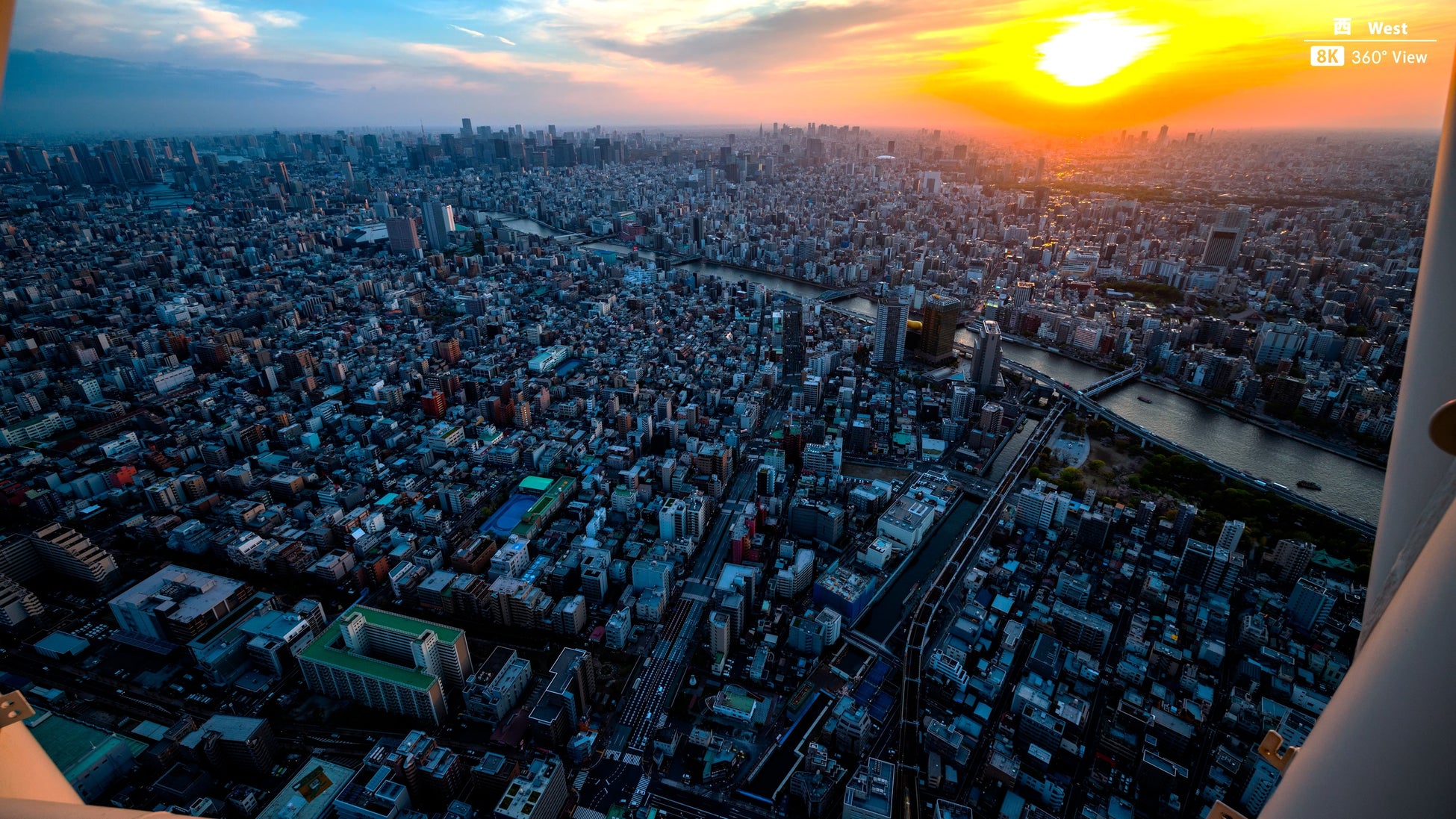 SKYTREE(R) 8Kナビは、各方角から見える“24時間の眺望の移り変わり”を約5分間にまとめたタイムラプスの8K映像コンテンツです。時間の流れとともに眺望の移り変わりを体験することができ、昼間のご来場でも夜景を、夜間でのご来場でも昼間の景色を、さらに眺望不良時でも晴天時の景色を体験することができます。