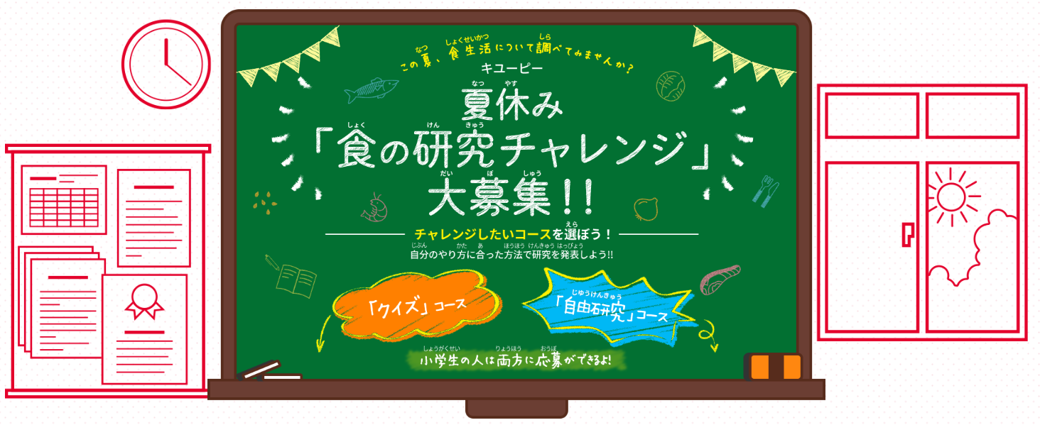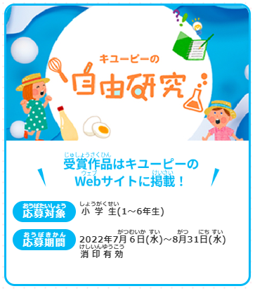 キユーピー株式会社(本社:東京都渋谷区、代表取締役 社長執行役員:髙宮 満、以下キユーピー)は、キユーピー公式サイト内の食育コンテンツ『食生活アカデミー』に、夏休み「食の研究チャレンジ」大募集!!を7月6日(水)に公開し、募集を開始します。