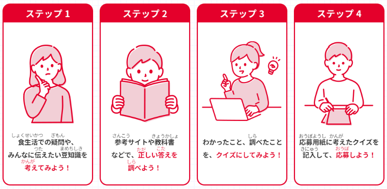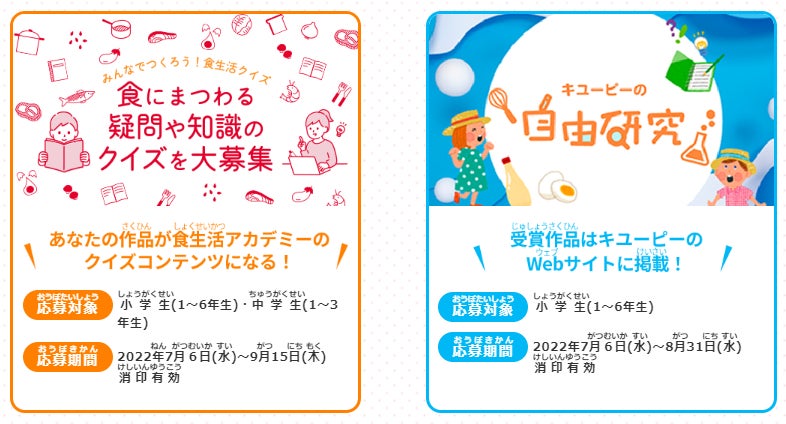 | 応募方法 | 公式サイトからダウンロードした応募用紙に、住所、電話番号、氏名(お子さま)、学年を明記の上、指定の住所までお送りください。公式サイト https://www.kewpie.com/academy/research/ | 公式サイトからダウンロードした応募用紙に、住所、電話番号、氏名(お子さま)、学年を明記の上、指定の住所までお送りください。公式サイト https://www.kewpie.com/academy/food-quiz/ |