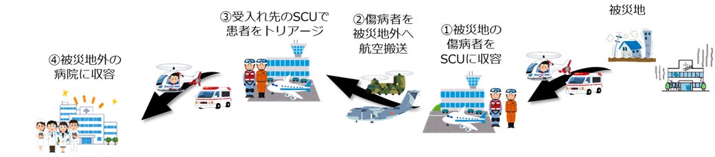 ※航空医療搬送拠点臨時医療施設(SCU):Staging Care Unitの頭文字をとった略称で、大規模災害の際、傷病者を根本治療が行える被災地外の災害拠点病院等に広域医療搬送するために設置される臨時医療施設のこと。