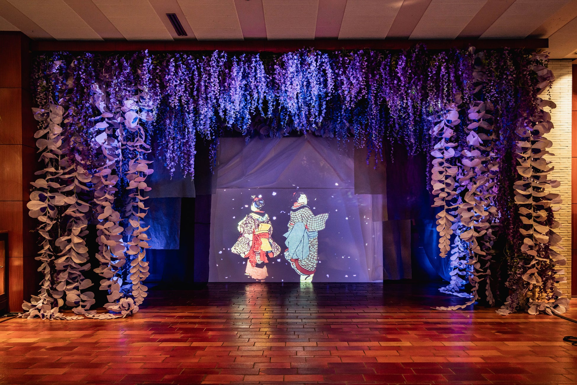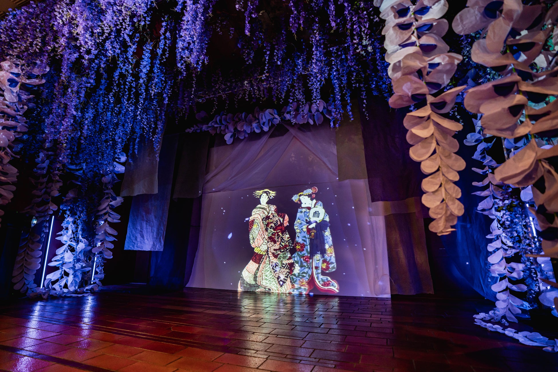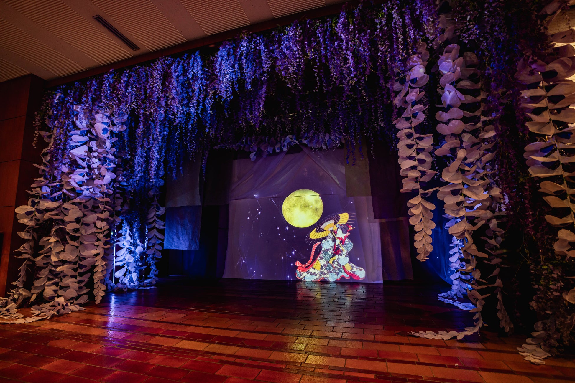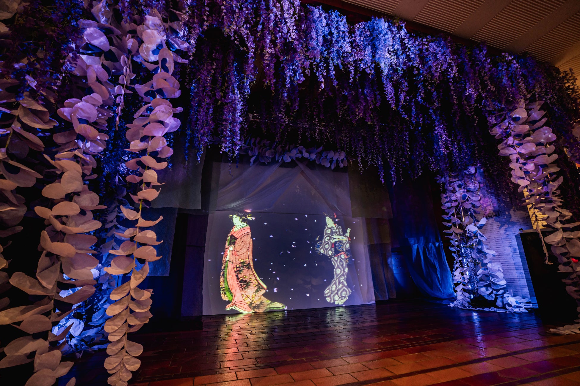 本展示は、藤の花のオブジェを華やかにあしらい、その内側に浮世絵に描かれた美人画が動き出すプロジェクションマッピング映像を組み合わせたデジタルインスタレーション作品となっています。