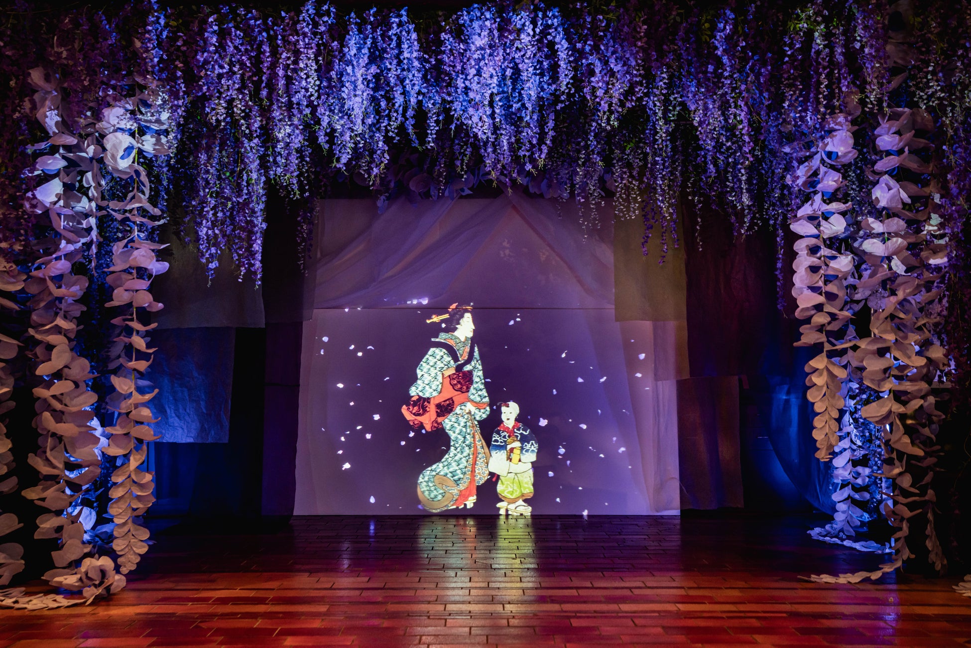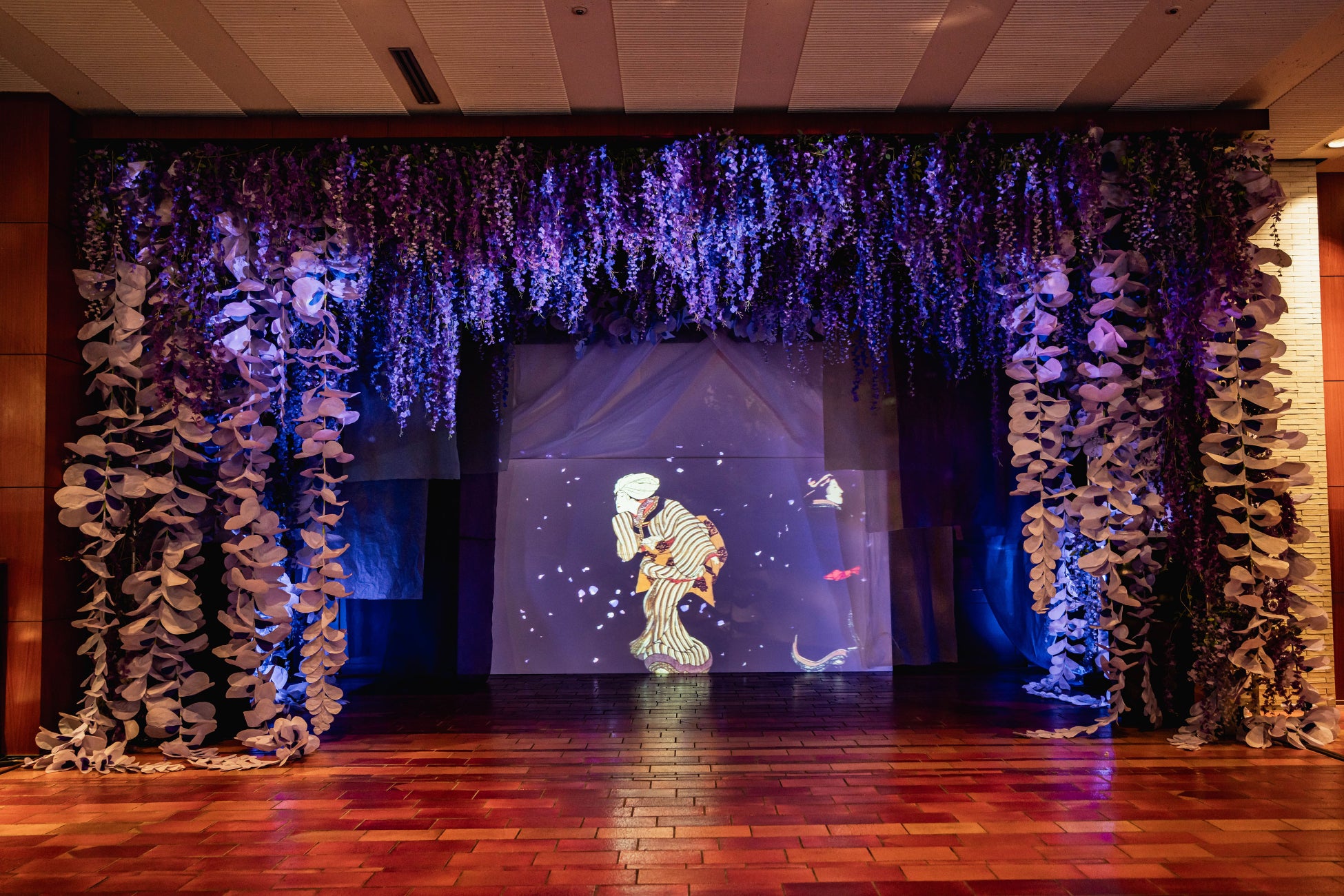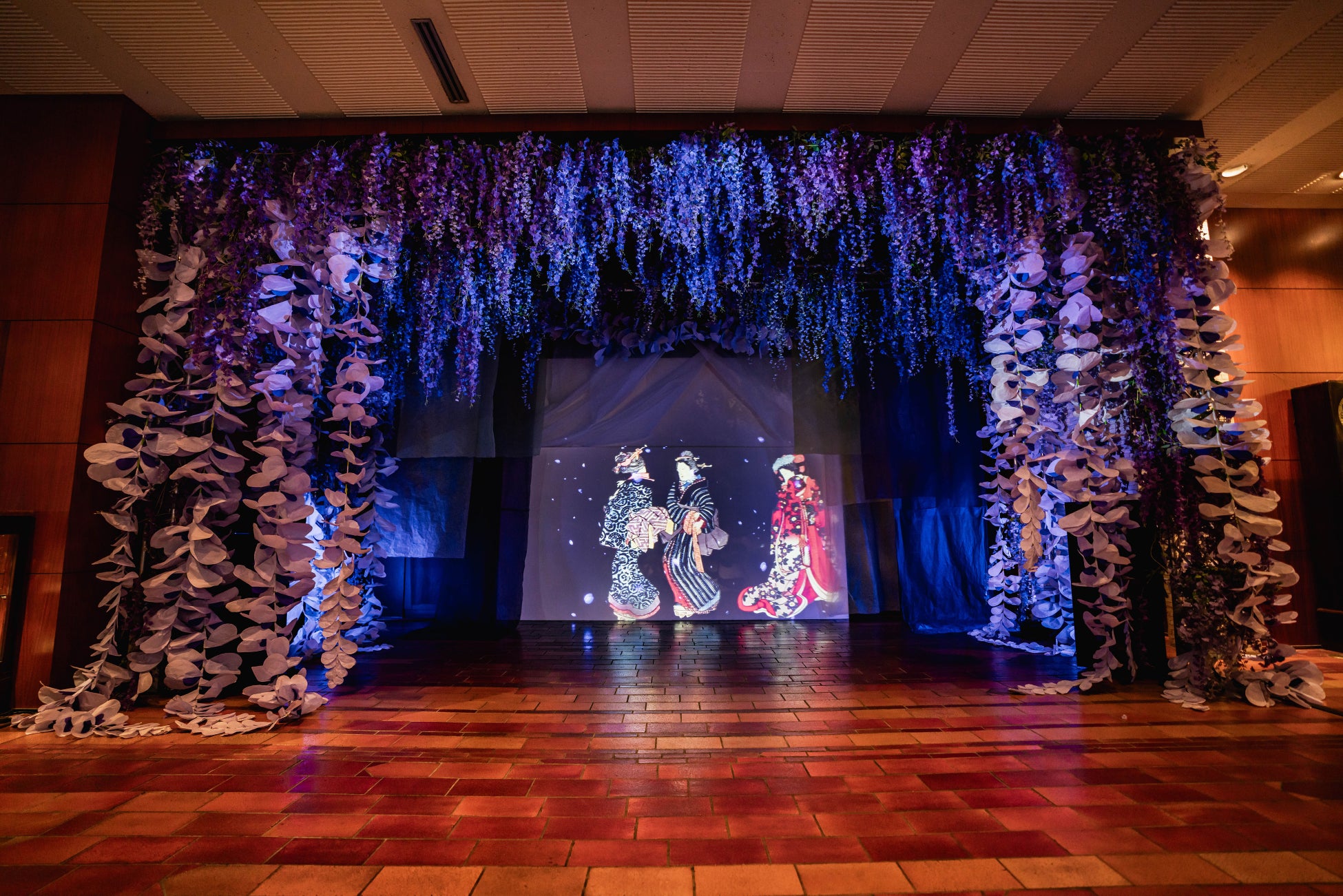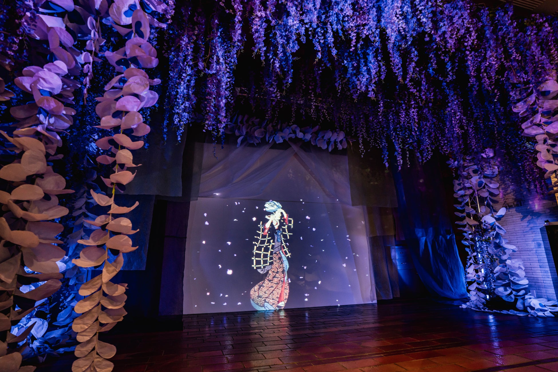 本展示は、藤の花のオブジェを華やかにあしらい、その内側に浮世絵に描かれた美人画が動き出すプロジェクションマッピング映像を組み合わせたデジタルインスタレーション作品となっています。