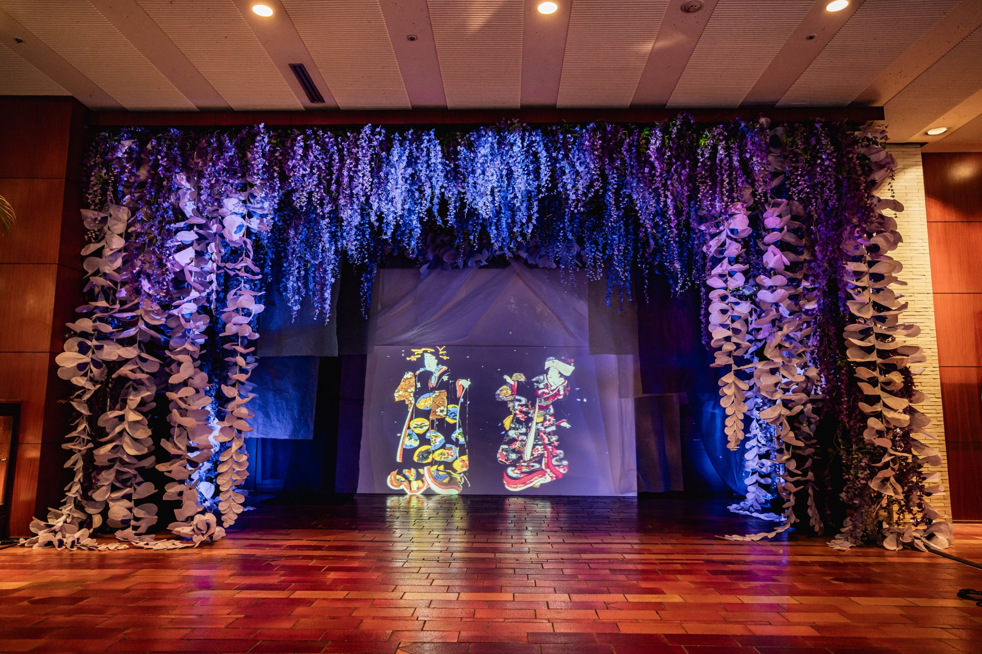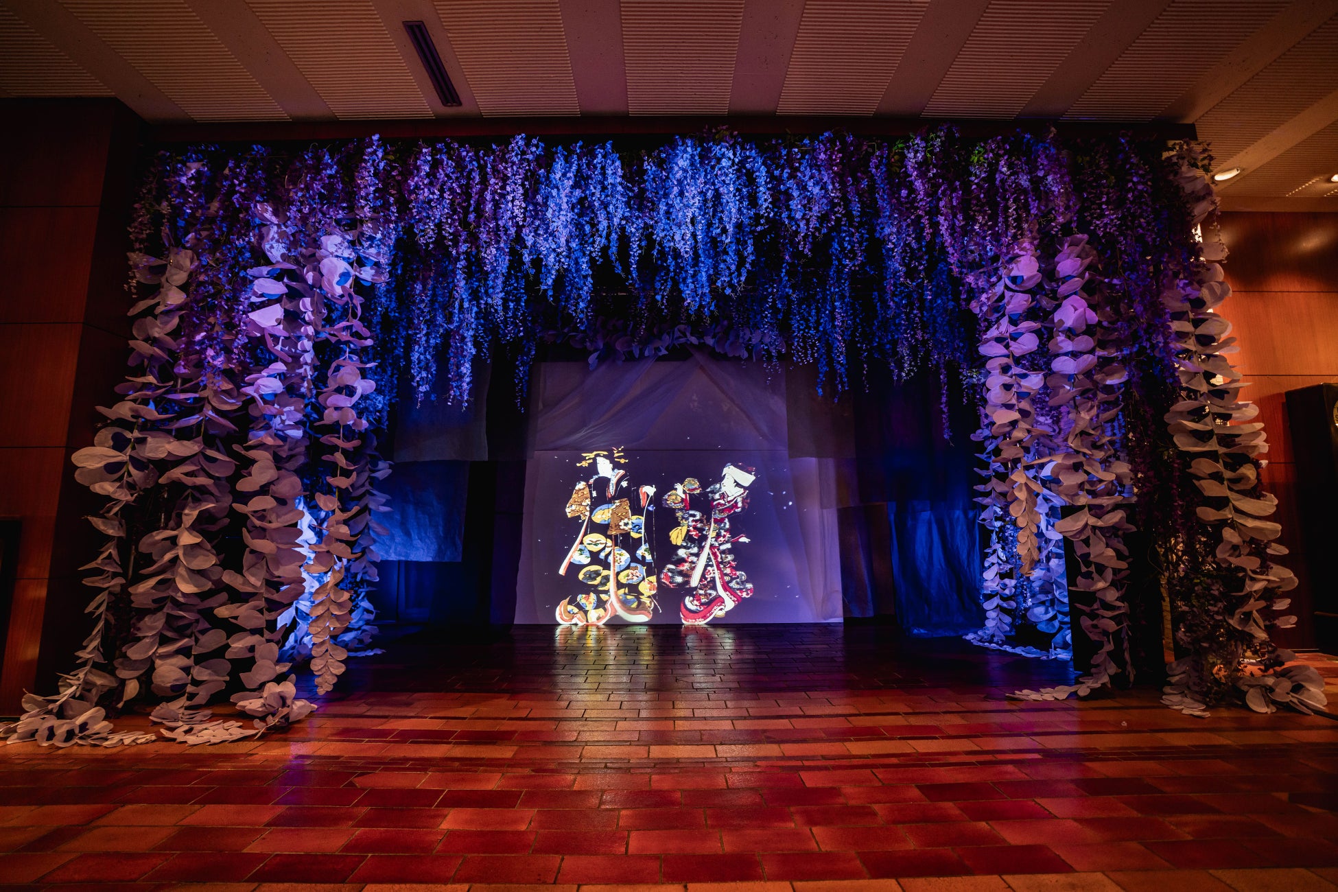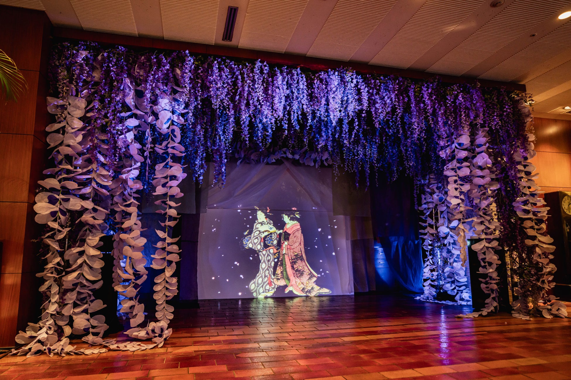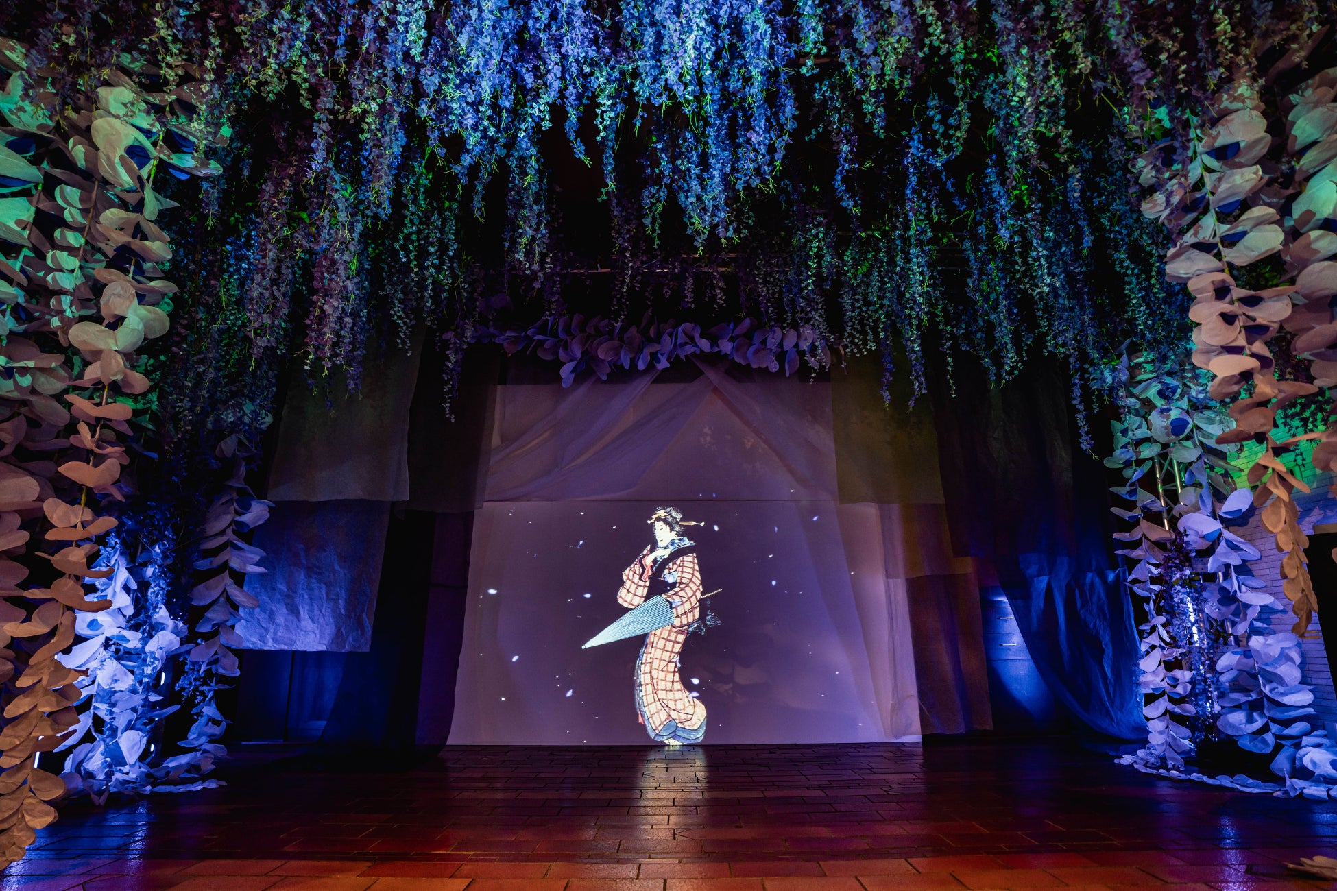 本展示は、藤の花のオブジェを華やかにあしらい、その内側に浮世絵に描かれた美人画が動き出すプロジェクションマッピング映像を組み合わせたデジタルインスタレーション作品となっています。