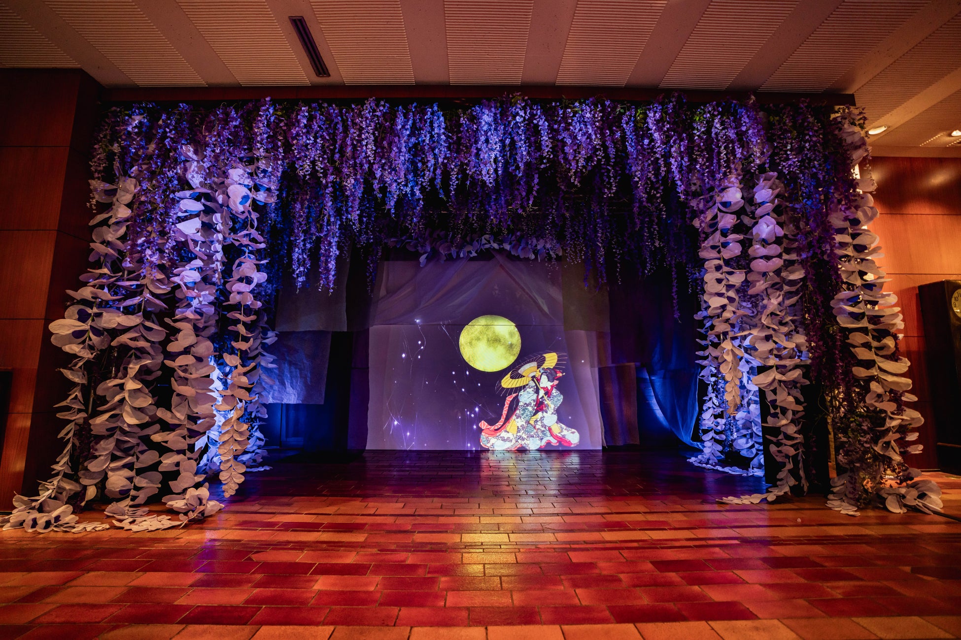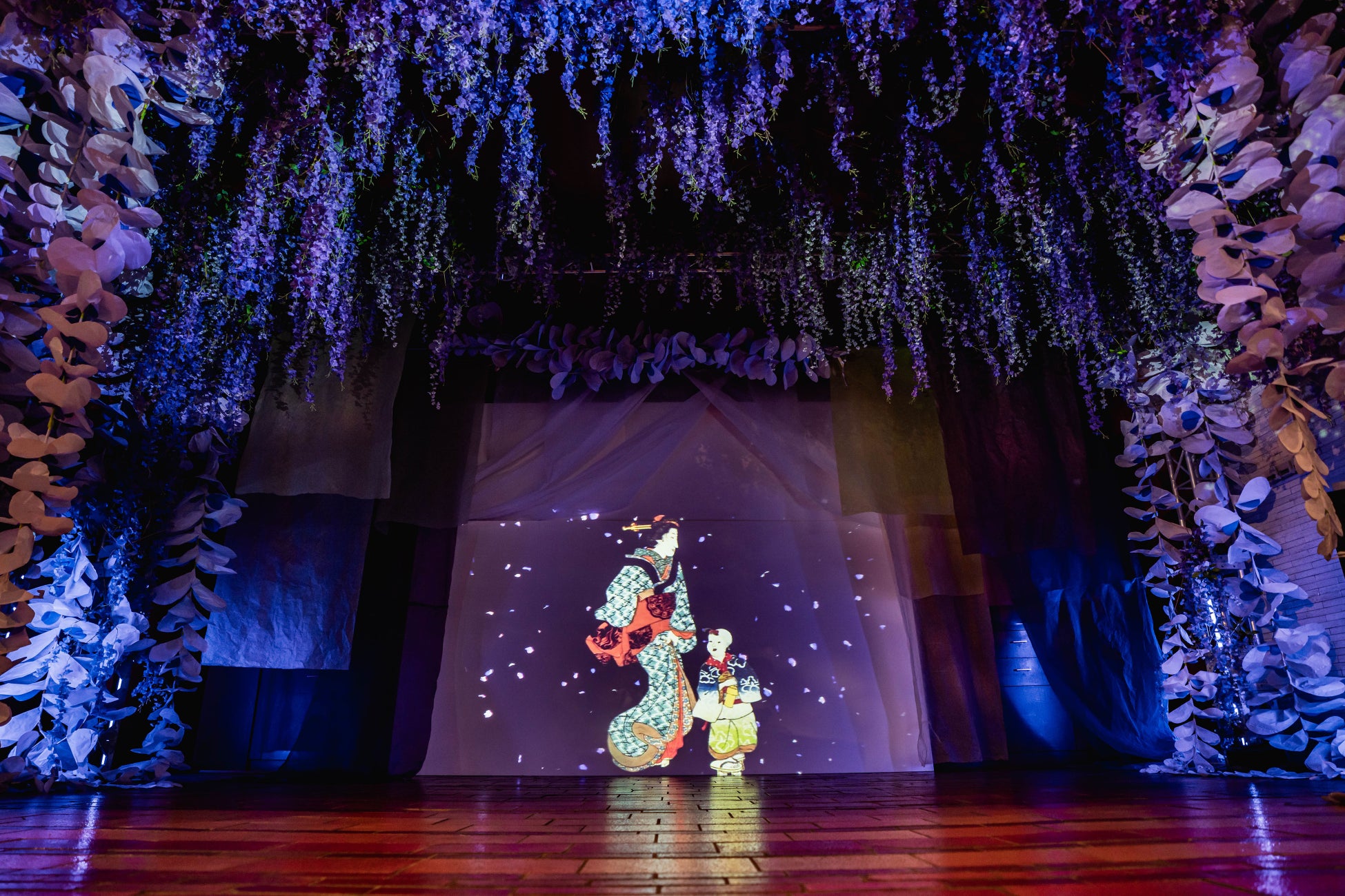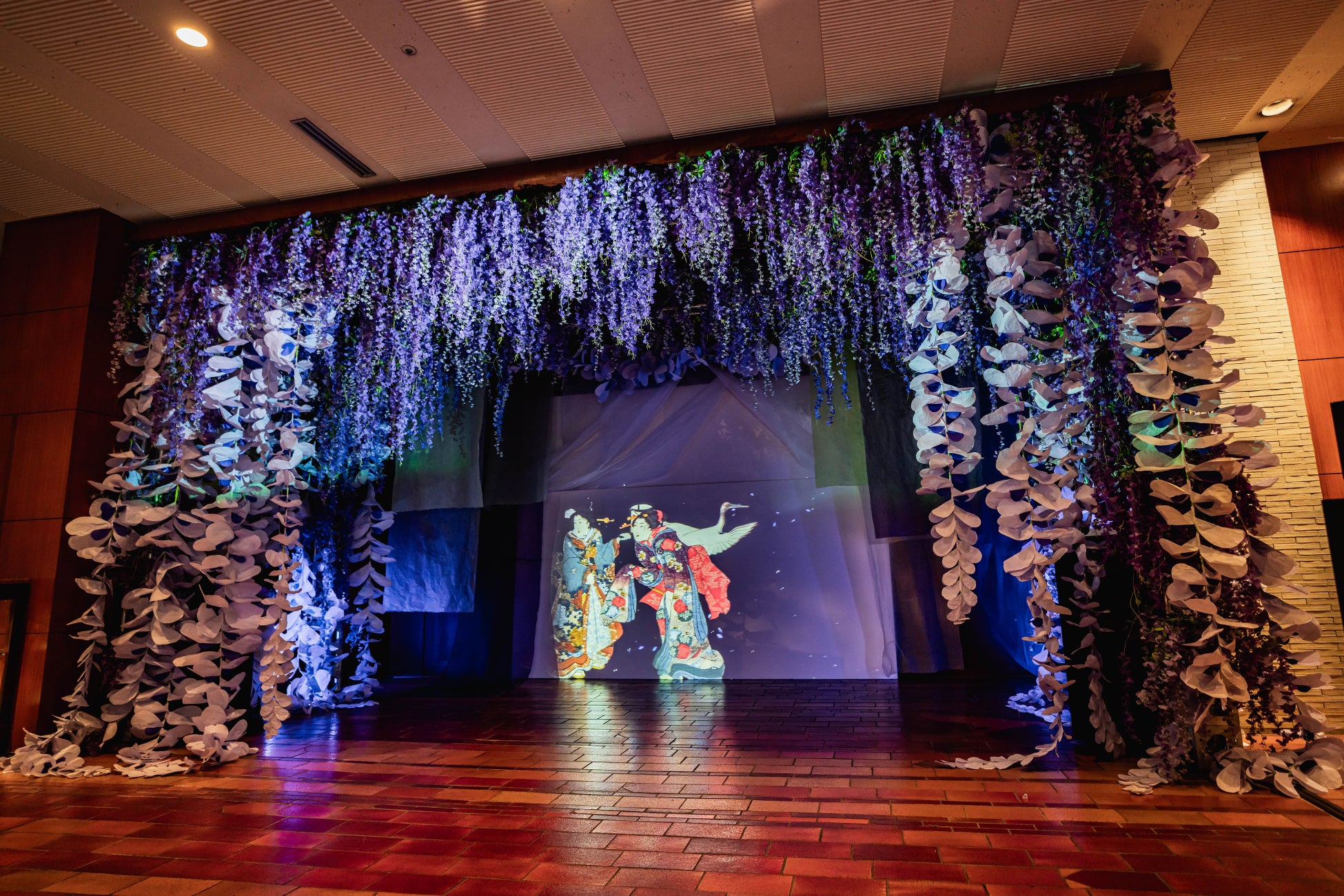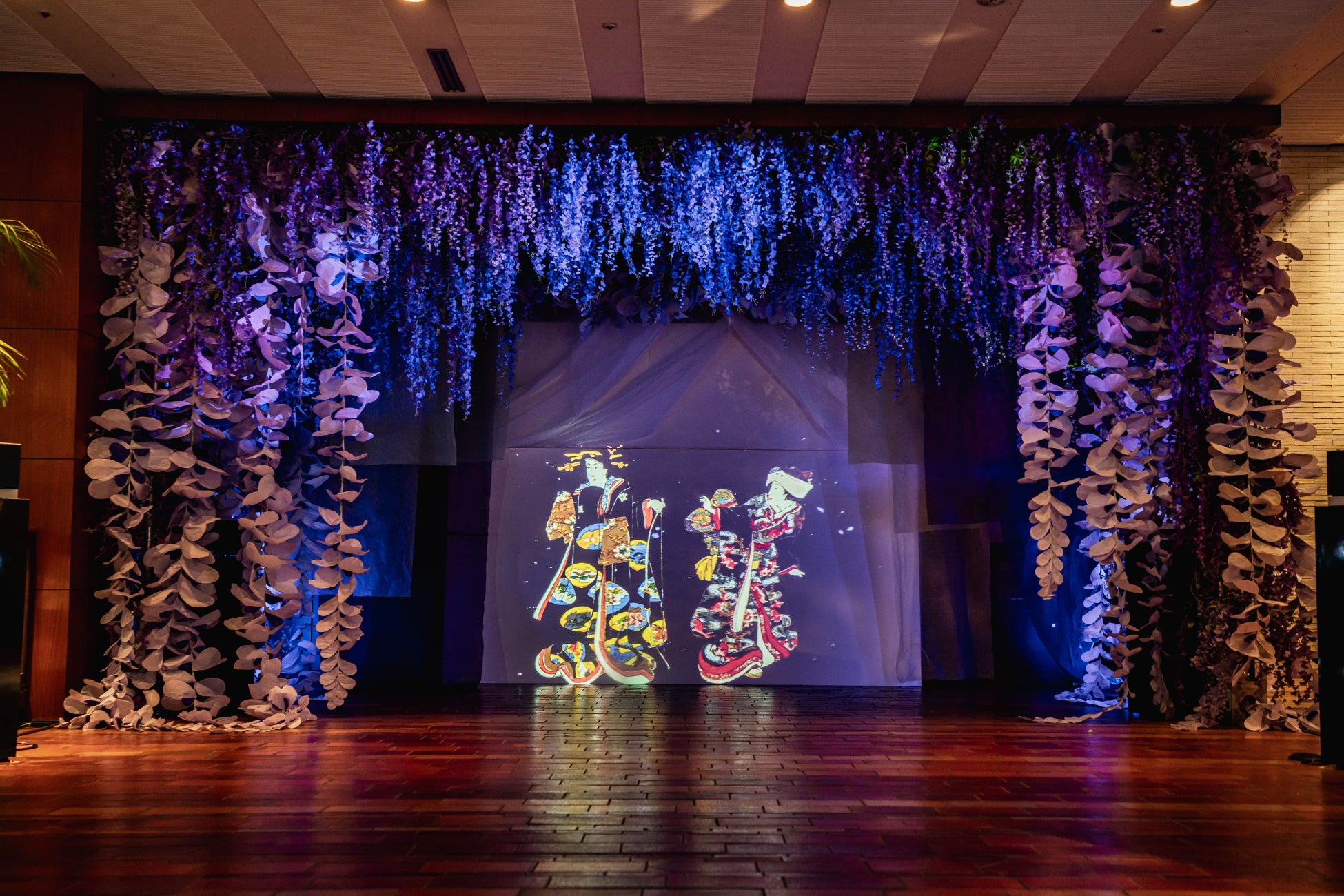 本展示は、藤の花のオブジェを華やかにあしらい、その内側に浮世絵に描かれた美人画が動き出すプロジェクションマッピング映像を組み合わせたデジタルインスタレーション作品となっています。