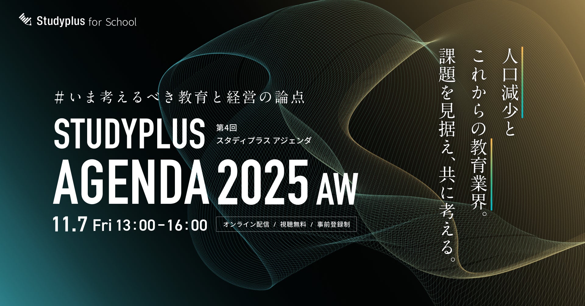 教育機関向けコミュニケーションプラットフォーム「Studyplus for School」を提供するスタディプラス株式会社(本社:東京都千代田区、代表取締役:廣瀬高志、以下スタディプラス)は、2025年11月7日(金)に「Studyplus Agenda 2025 AW ~いま考えるべき教育と経営の論点~」を開催することをお知らせいたします。
