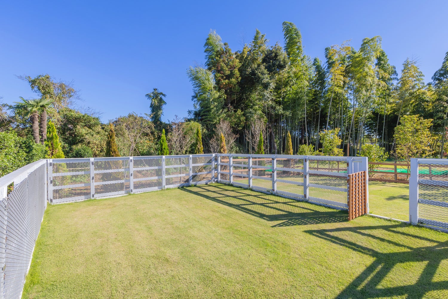 天然芝のプライベートドッグランを併設しており、ワンちゃんも周りを気にせず心置きなく大はしゃぎ!