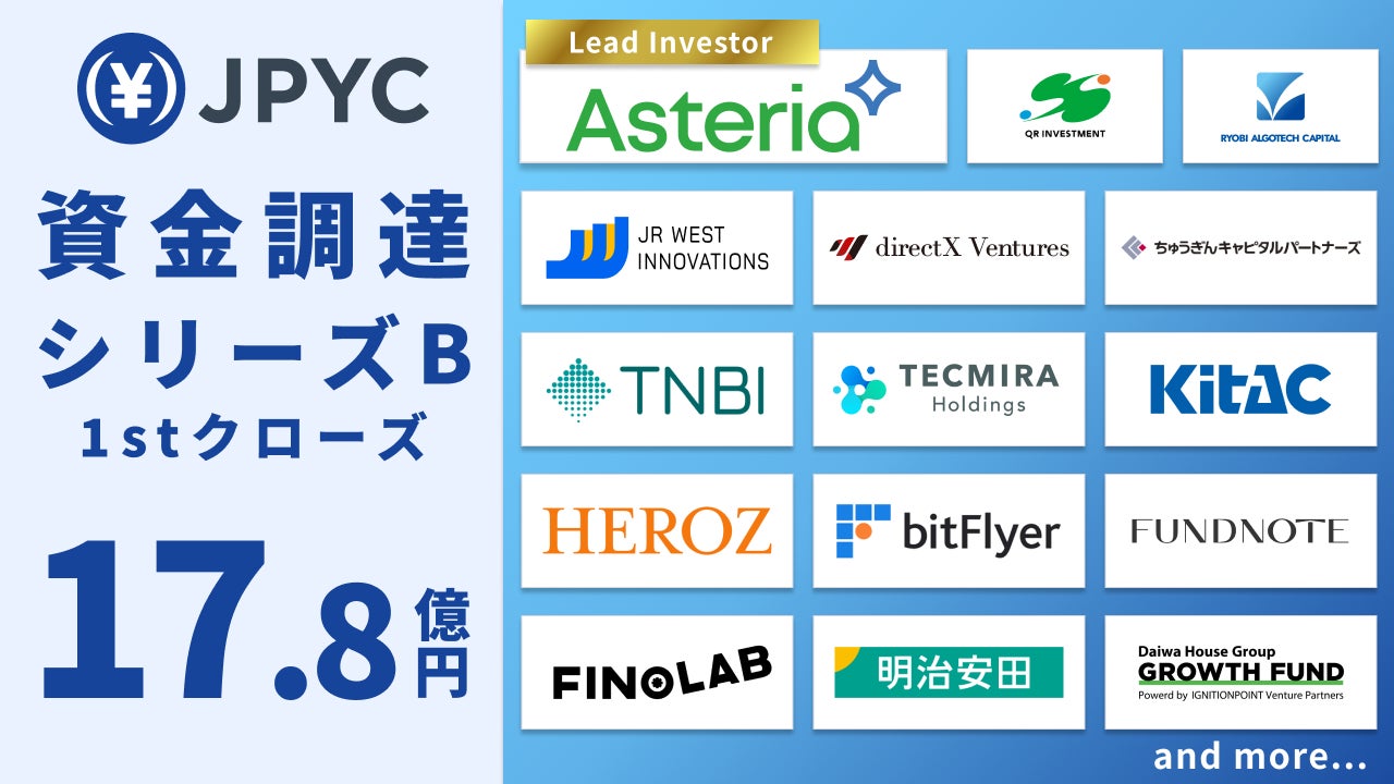 日本円ステーブルコイン「JPYC」を発行・運営するJPYC株式会社(本社:東京都 千代田区 代表取締役:岡部 典孝、以下当社)は、シリーズBラウンドのファーストクローズにおいて、アステリア株式会社をリード投資家とし、総額17.8億円の資金調達を完了する予定です。