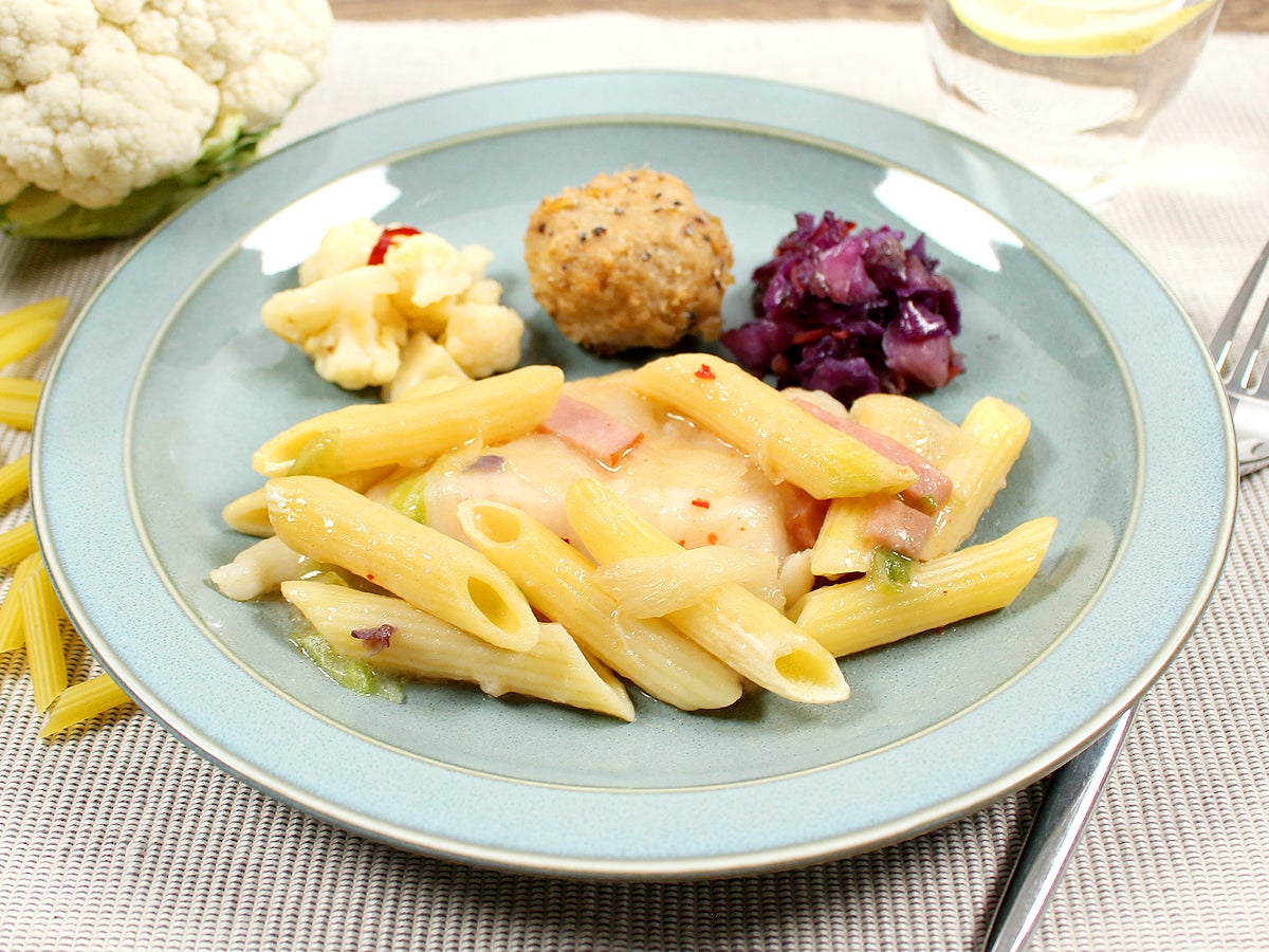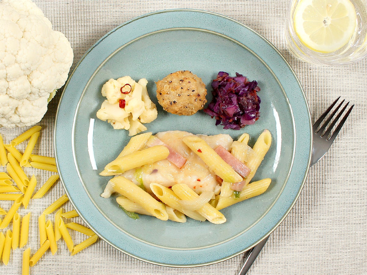 ロースターでしっとりと焼き上げた白身魚にぺペロンチーノソースを合わせました。レタス、ペンネ、ベーコンをトッピングしており、あっさりとした味わいのプレートに仕上げました。 副菜は、コンソメ風味のガーリックカリフラワー、ブラックペッパーがアクセントのオニオンミートボール、オニオンをきかした赤キャベツサラダです。