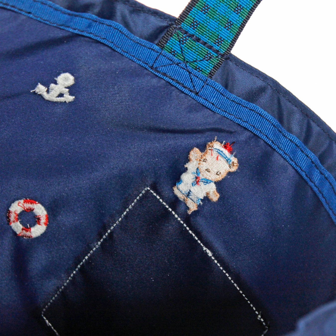 船やイカリ、塔など神戸のマリンモチーフが刺繍されており、可愛らしいバッグになっています。オリジナルカラーで施された紀ノ国屋のロゴは、織りネームで再現されています。