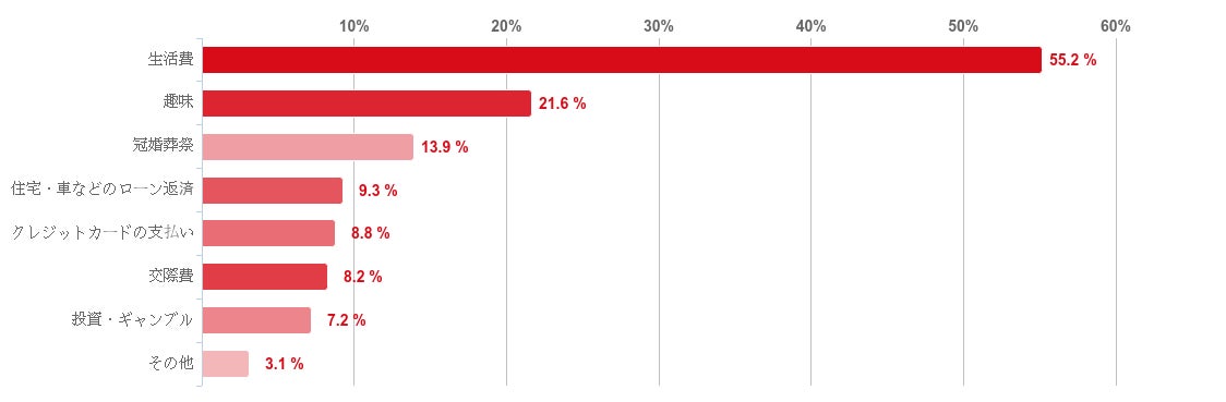 「生活費」との回答が55.2%で過半数となり、「趣味」や「冠婚葬祭」などがこれに続いた。