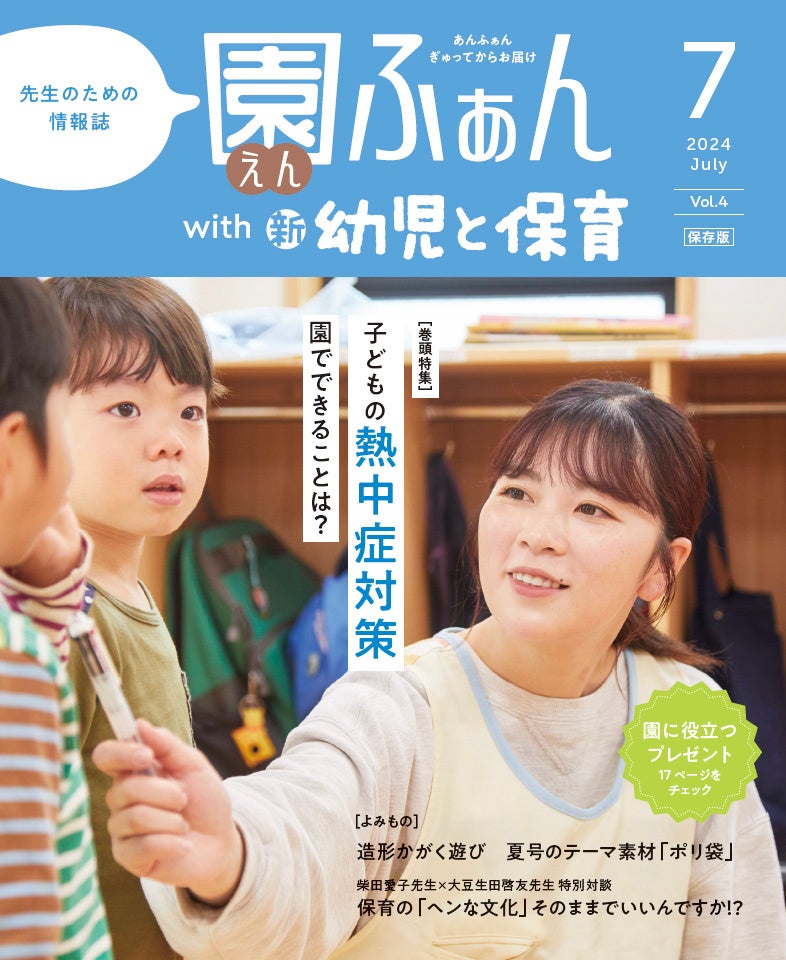 「園ふぁん with 新 幼児と保育」7月号では、「暑い夏、到来! 子どもの熱中症対策 園でできることは?」を特集。園の先生向けに、熱中症の原因や症状の見分け方、予防・対策を紹介しています。
