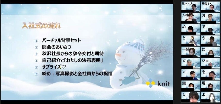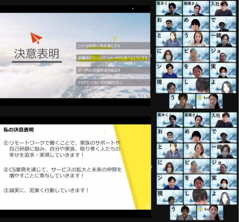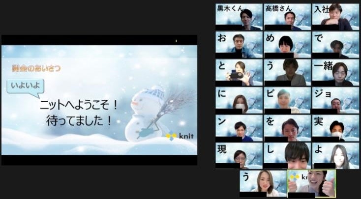 オンラインアウトソーシングサービス「HELP YOU(ヘルプユー)」を運営する株式会社ニット(本社:東京都品川区、代表取締役:秋沢崇夫、以下ニット)は、2015年にフルリモート前提で創業し、現在、約400人が日本全国・世界33カ国からオンラインで業務を遂行しています。そのため、新たなメンバーも世界各国・日本全国から入社してきてくれます。新型コロナウイルスの感染予防策になるだけでなく、メンバー全員とのつながりを創出できるのがオンラインイベントです。当社は今までのオンライン事業のノウハウを活かし、他社とはひと味違うサプライズをコンテンツに入れた「オンライン入社式」を令和4年1月13日に実施いたしました。今回はその実施レポートをお届けいたします。